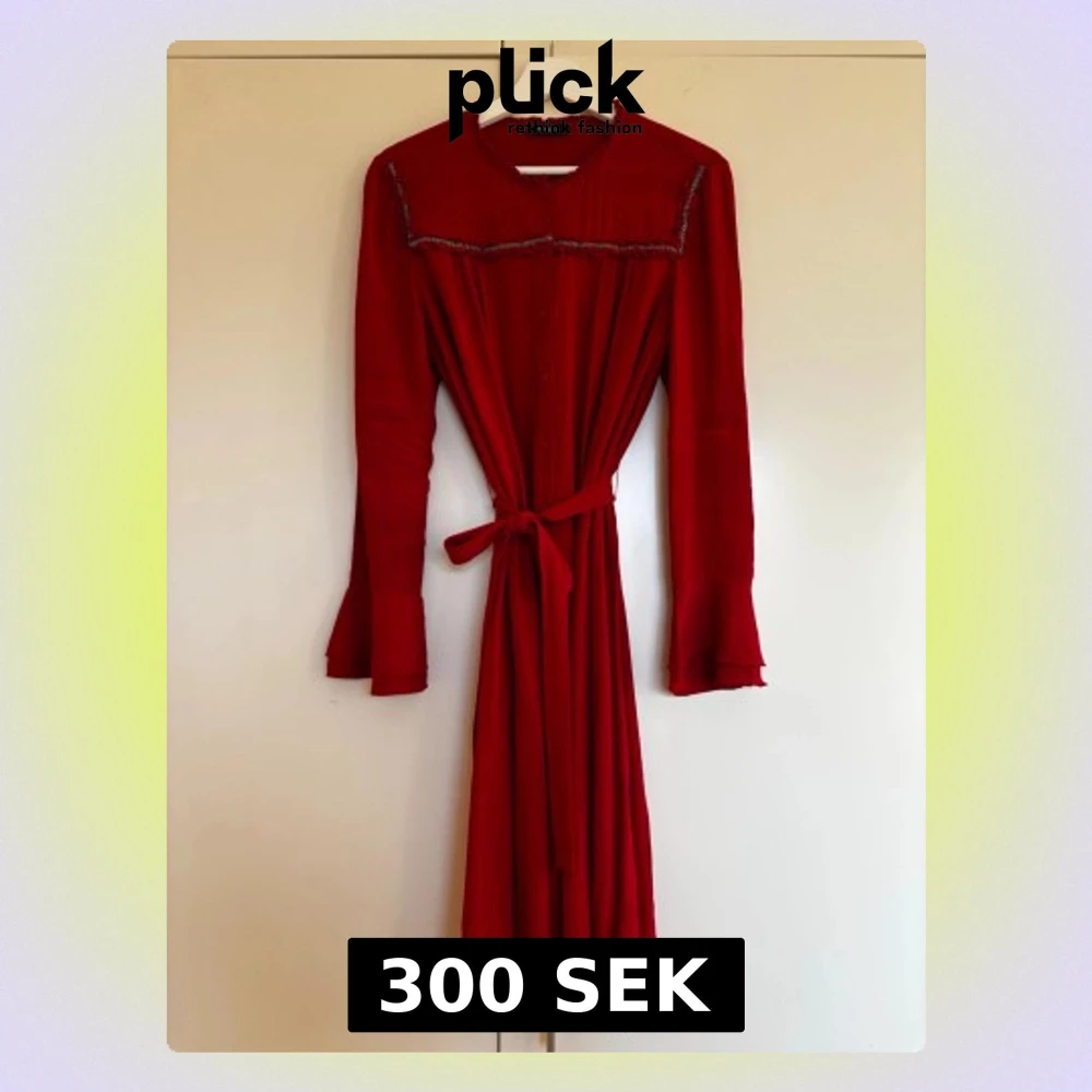 Snygg röd midiklänning från MAX&Co. med knytband i midjan, volangdetaljer vid halsringning och trumpetärmslut samt dekorativ pärlrad framtill. Knappar längs framsidan. Viskos. Perfekt skick!
