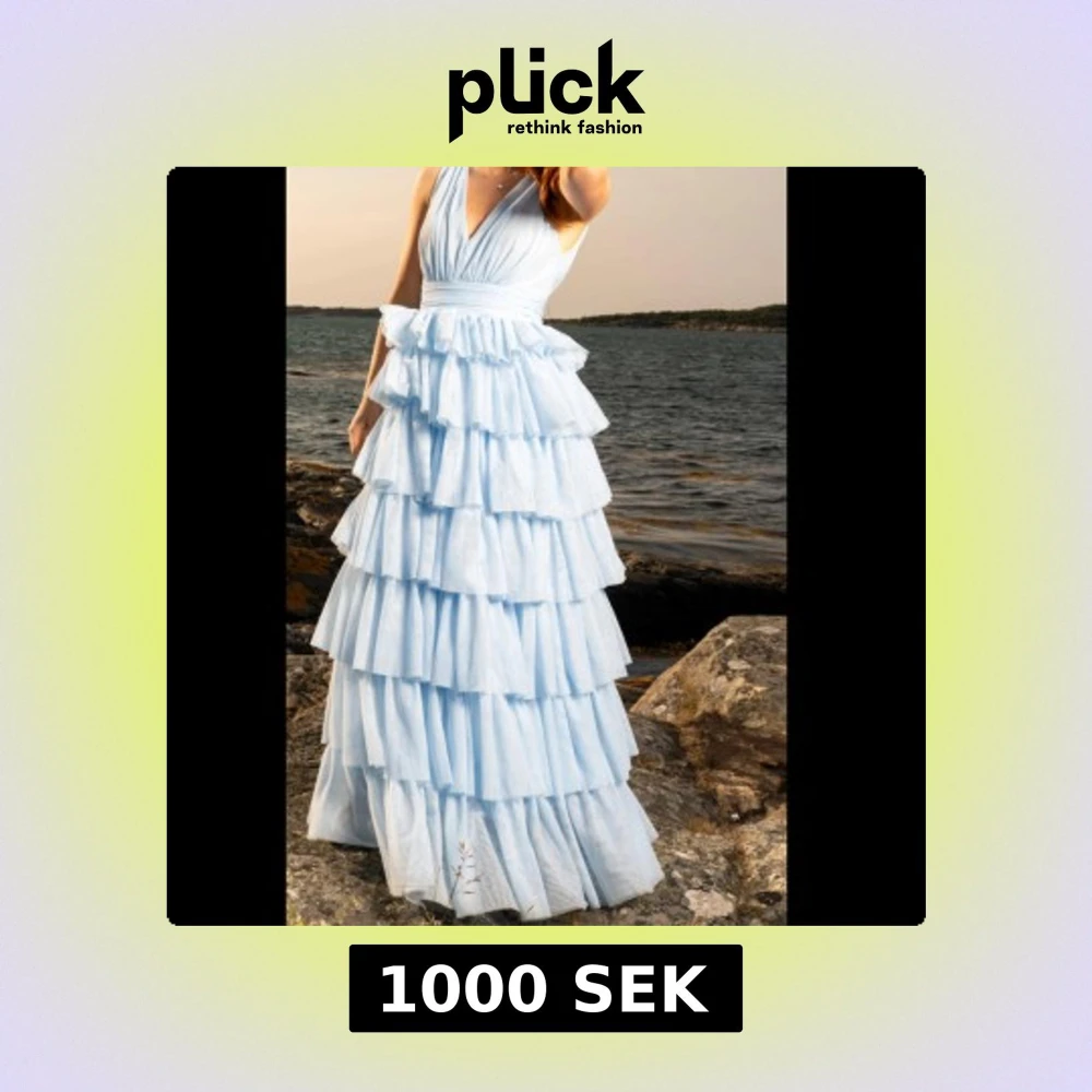 Drömmig långklänning från Bubbleroom i ljusblått med flera lager volanger och djup v-ringning. Klänningen har omlottkänsla upptill, bred midja och är ärmlös. Perfekt för bal eller student. Materialet är lätt och ger en flowy känsla. NY UTAN PRISLAPP‼️Använt bara en gång. Köpt för 1799 kr.