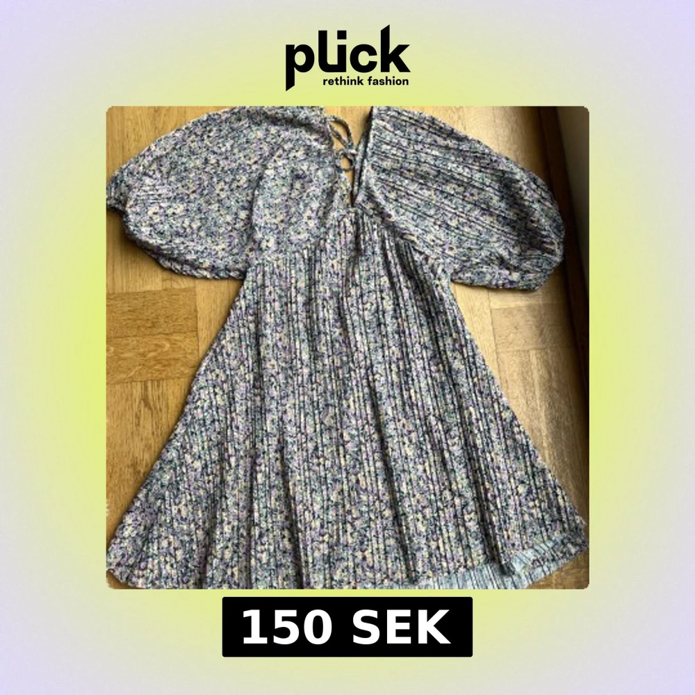 Supersöt kortklänning med blommigt mönster i lila, vit, gul och grön. Klänningen har v-ringning med snörning i ryggen och stora puffärmar. Den gör sig inte riktigt rättvis på bild, kan skicka bild på om det är utav intresse.