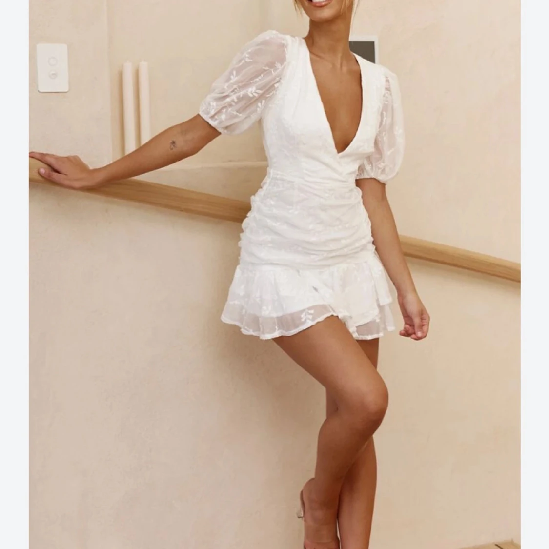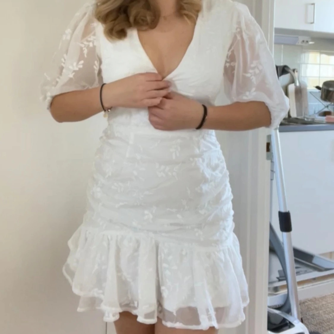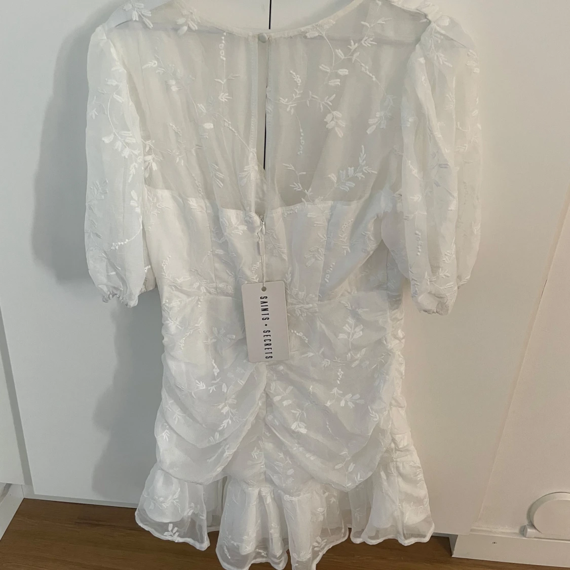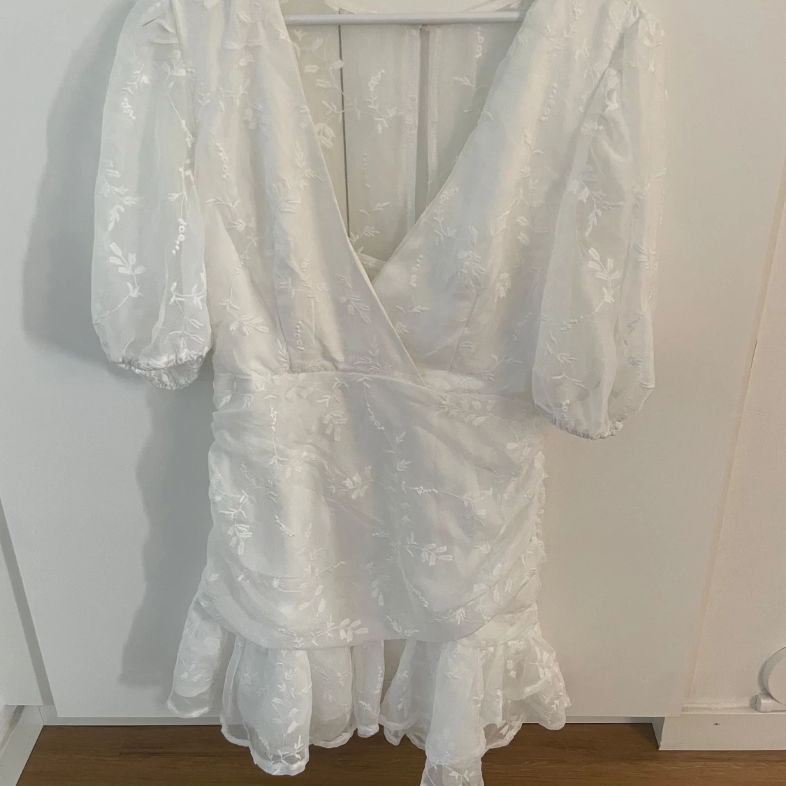Vit klänning som passar perfekt till studenten eller andra tillfällen. Klänningen är helt ny med prislappen kvar! I stolek L men skulle mer säga att den är en M