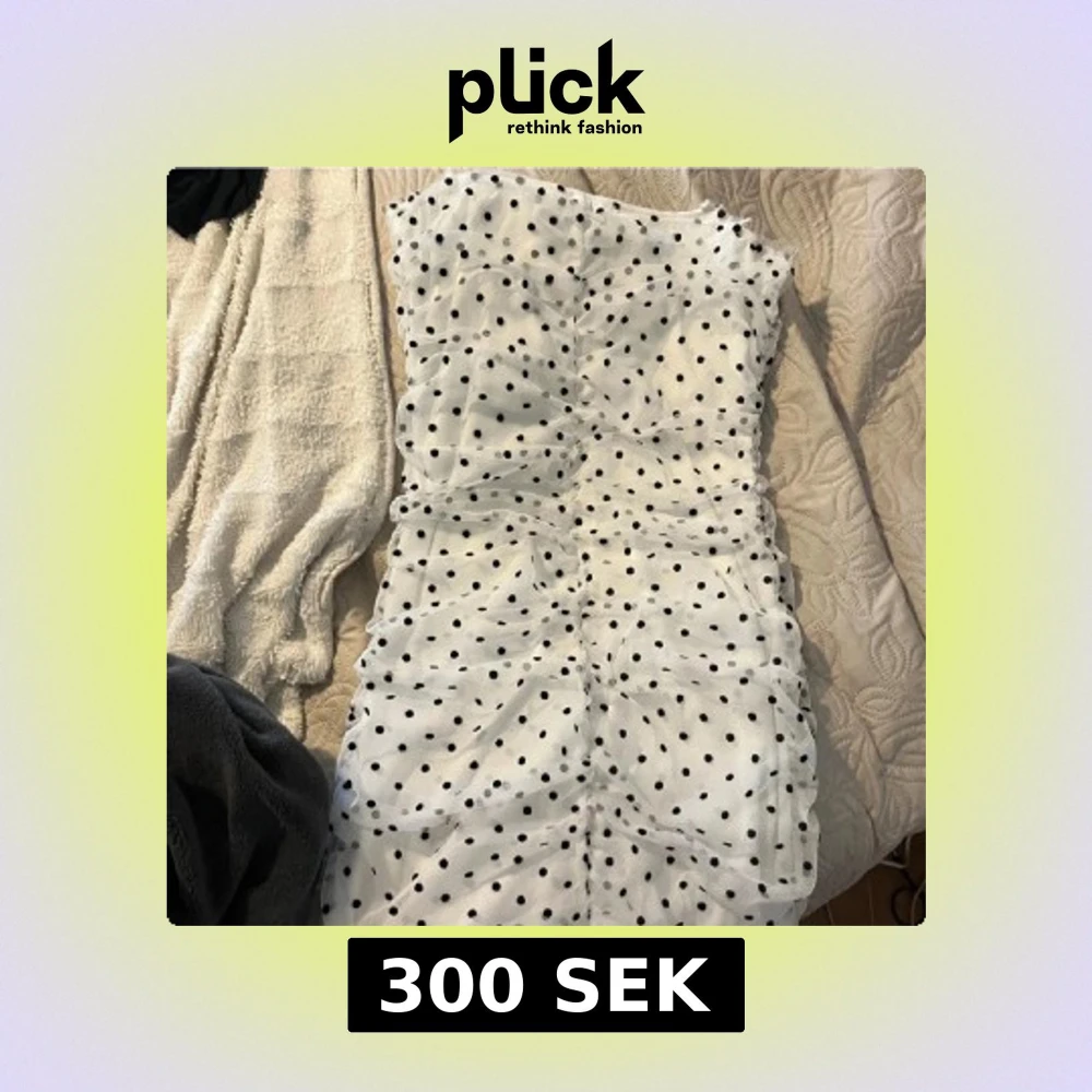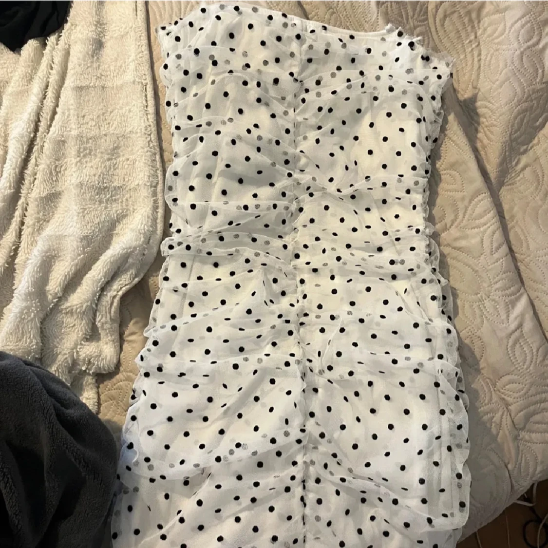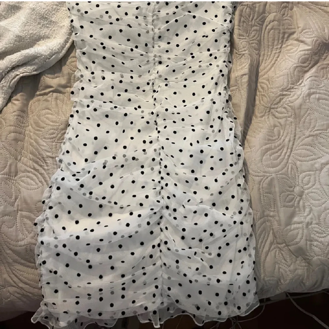 Säljer en vit axelbandslös klänning med svarta prickar och rynkade detaljer längs hela klänningen. Klänningen har en tight passform och är kort i modellen.