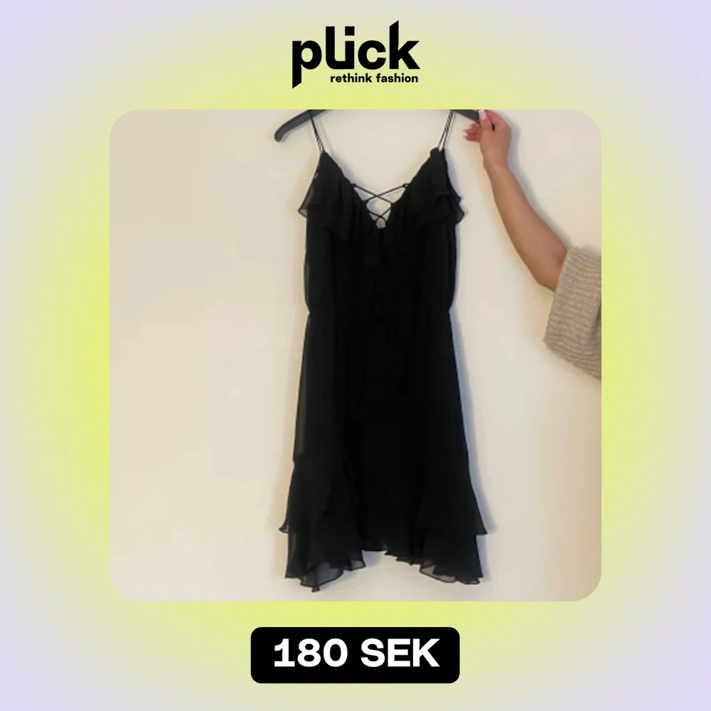 En svart, stillig klänning med snören vid bröstet. Klänningen har använts ett antal gånger, men är i bra skick.
