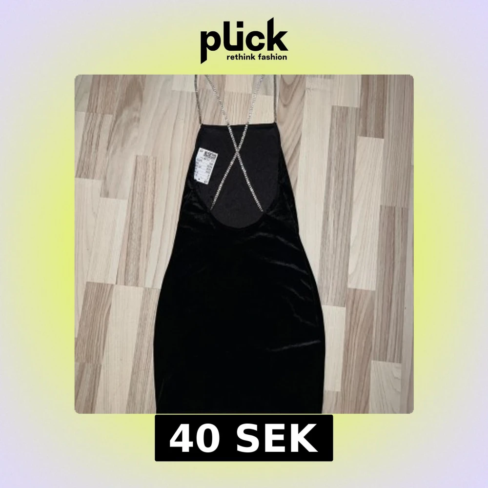 Strl Xs. Svart figursydd klänning i sammetsmaterial, remmar med ” diamanter ” som blir crisscross där bak. Helt ny och jättesexig. Ej genomskinlig! 📏 80cm