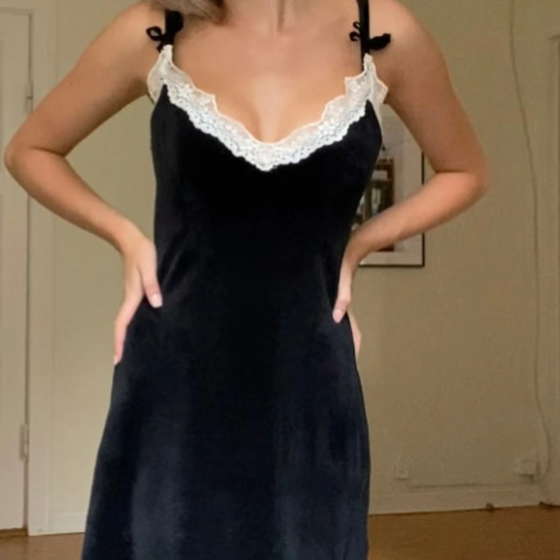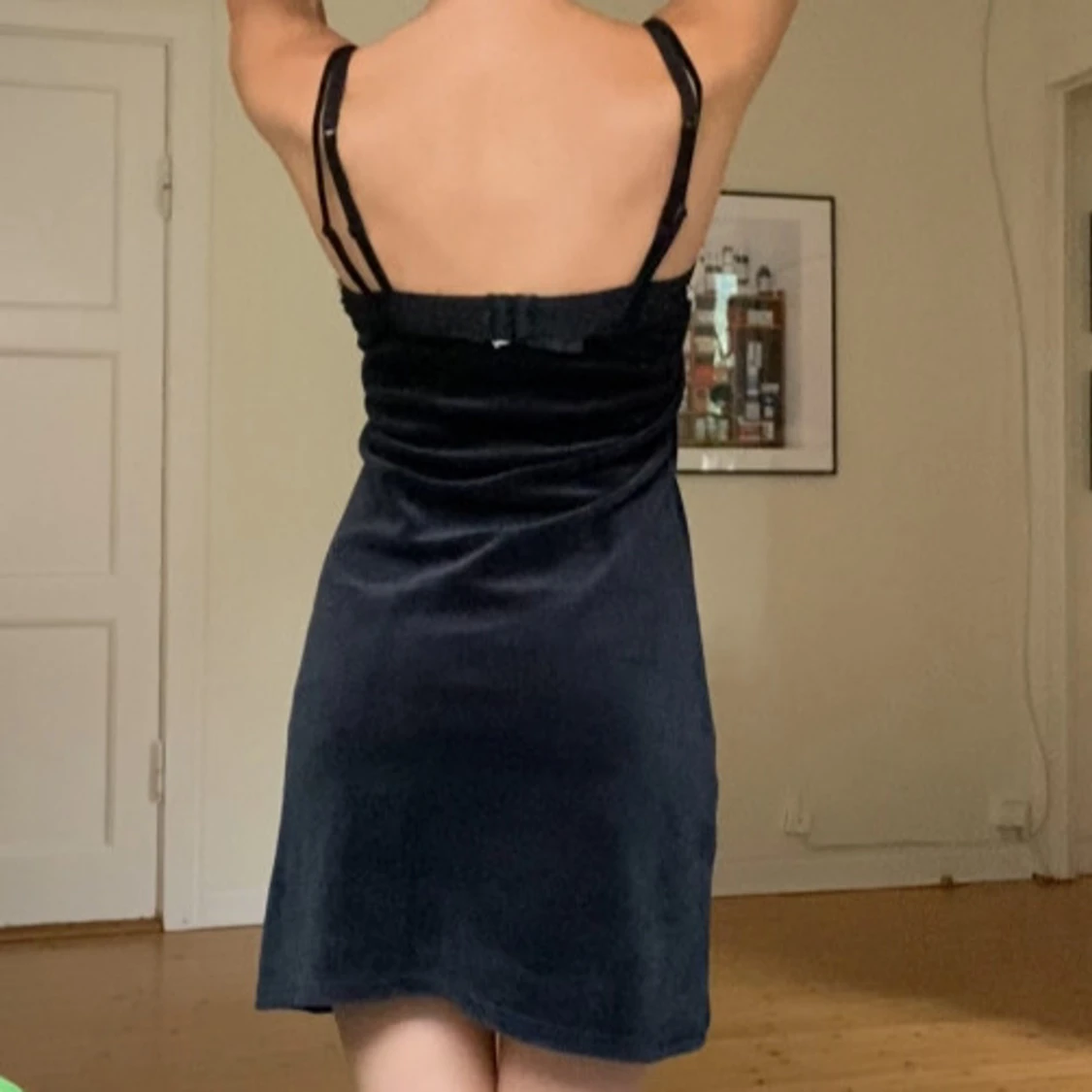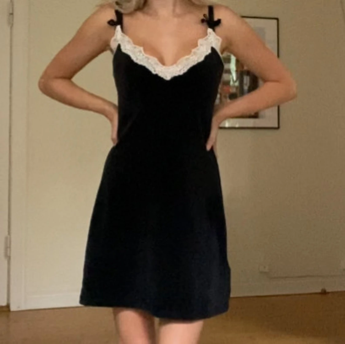 Kort klänning i sammet med spets- och rosettdetaljer! Aldrig använd. Från Motel Rocks.