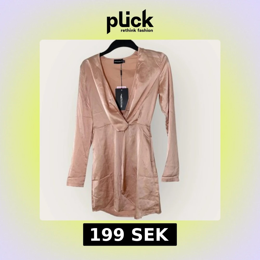 Snygg kort klänning i champagnefärgad satin från PrettyLittleThing. Djup v-ringning, omlott framtill och långa ärmar. Materialet har en lyxig glans och klänningen har dragkedja i sidan för enkel påklädning. Perfekt för dig som vill sticka ut.