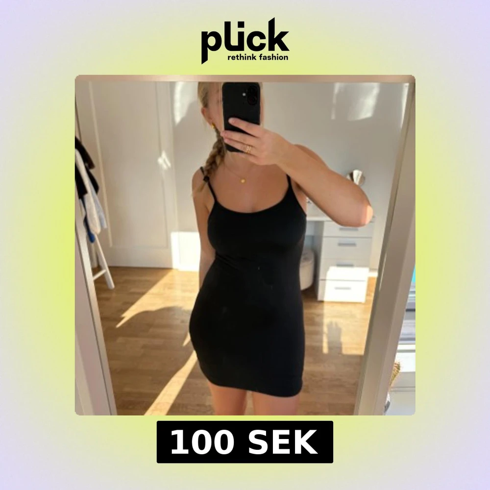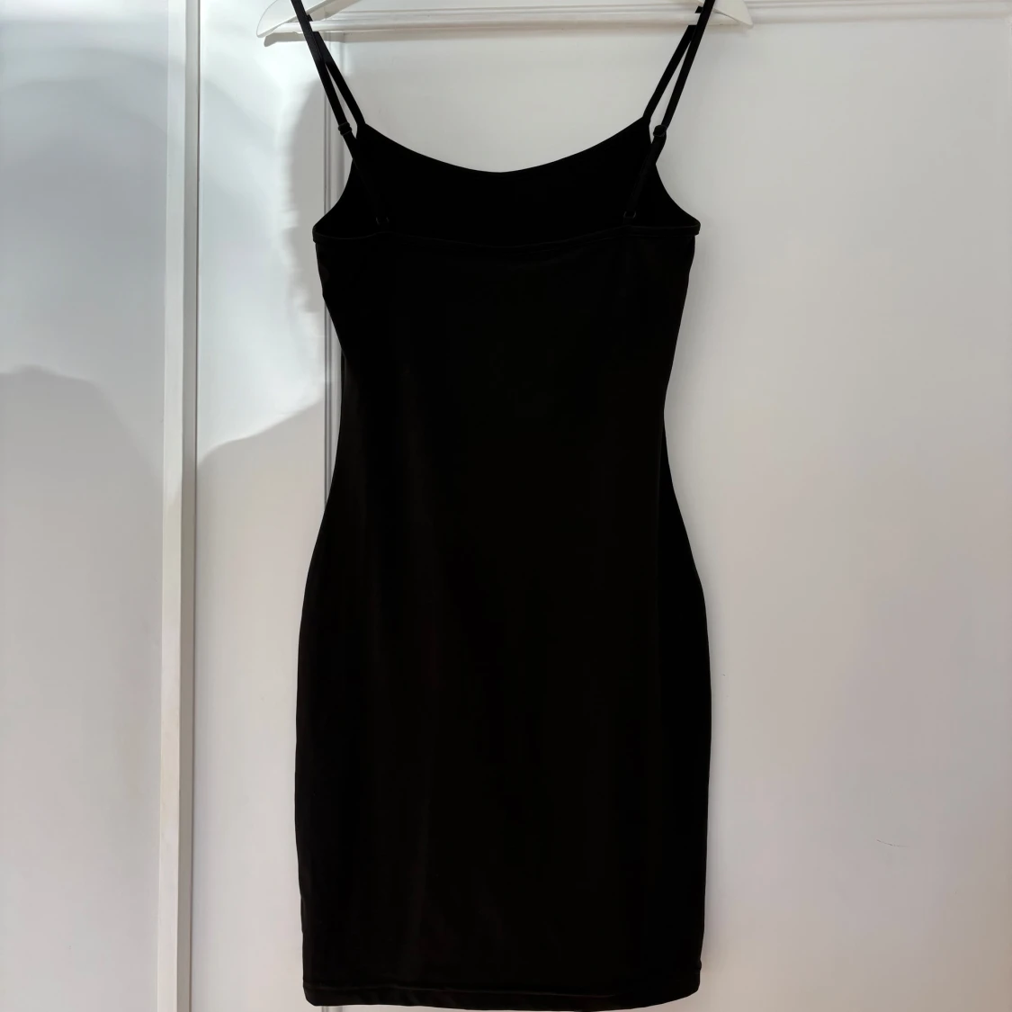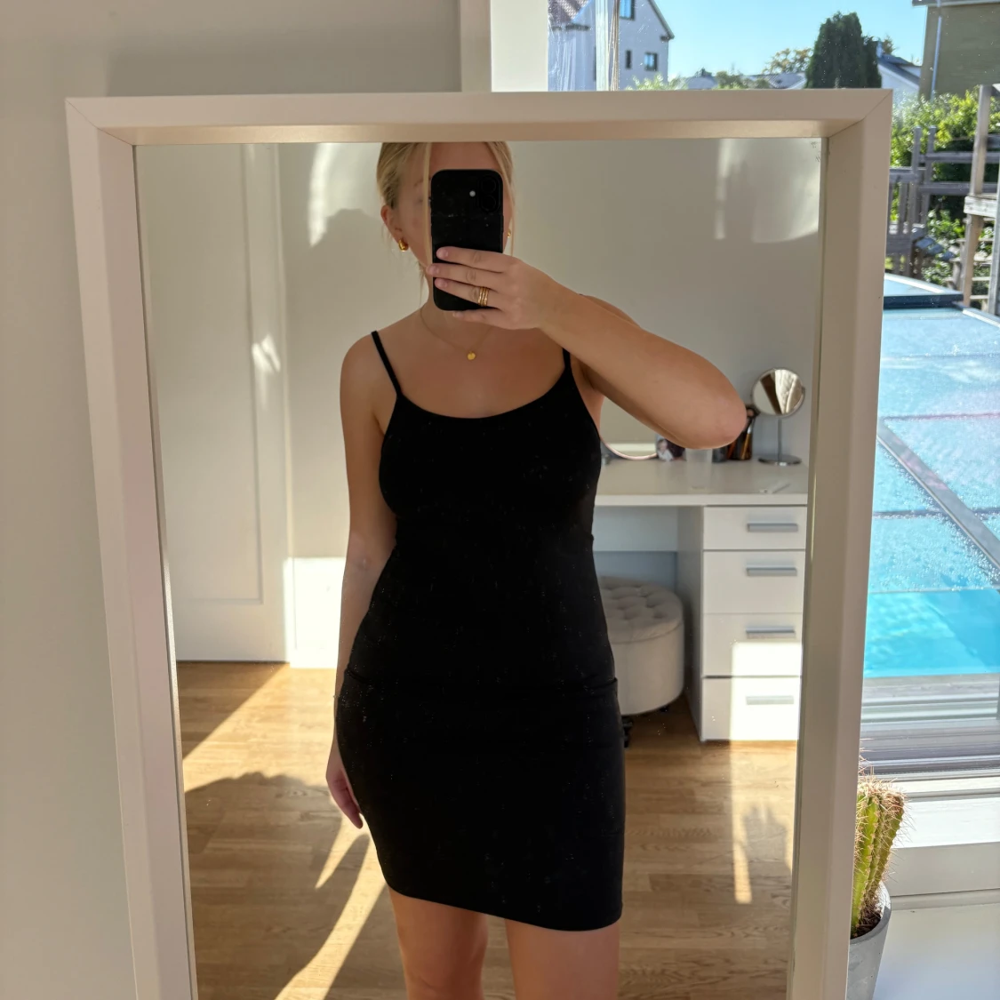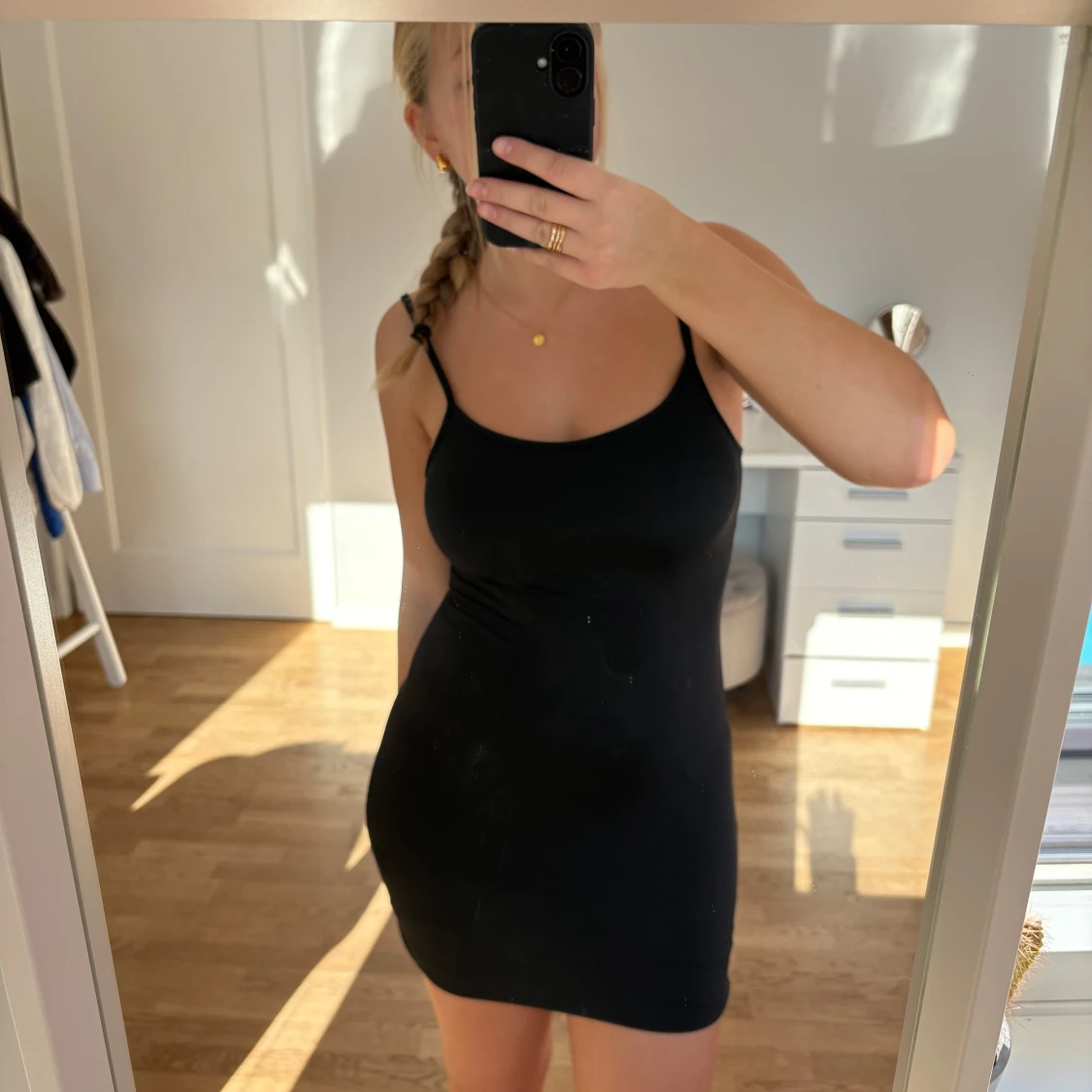 Svart miniklänning med smala axelband och tight passform i superskönt material. Klänningen är kort men går att välja om man vill ha den mini eller lite längre. Aldrig använd, storlek 36/s.