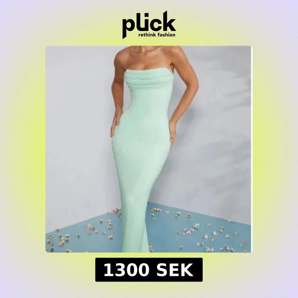 Supersnygg mintgrön långklänning med figurnära passform och axelbandslös design. Klänningen har en enkel, elegant siluett och lätt glittrig yta som ger extra wow-känsla. Perfekt för dig som vill sticka ut med stilren look.