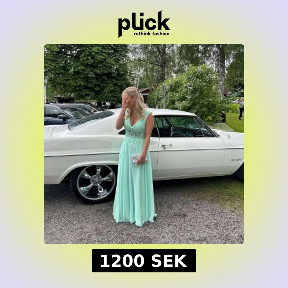 Elegant mintgrön långklänning med spetsdetaljer och v-ringad urringning. Klänningen har ärmlös design. Jag hade klänningen på balen och fick många komplimanger om klänningen och den fina färgen som sticker ut i mängden💕 Som referens är jag ca 170