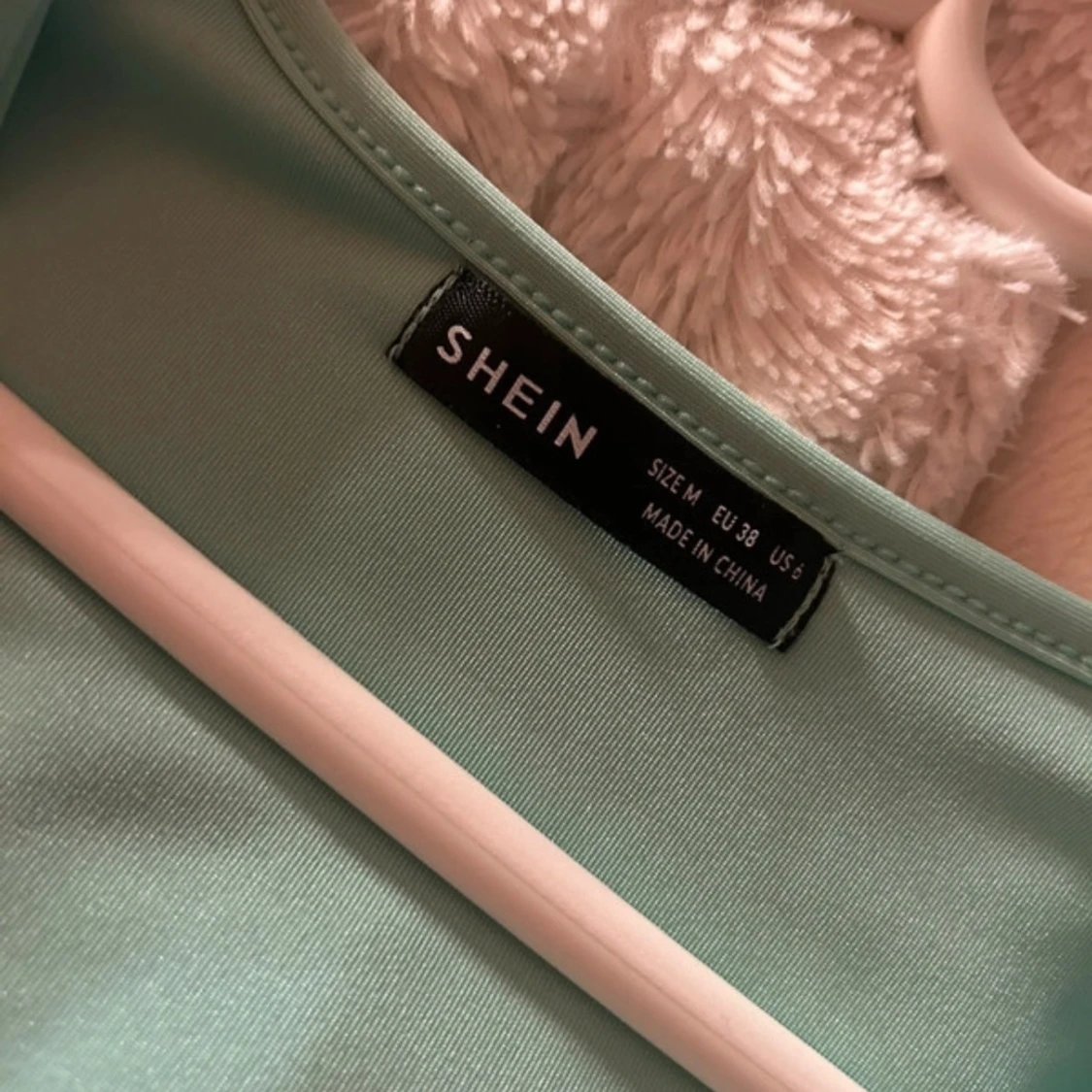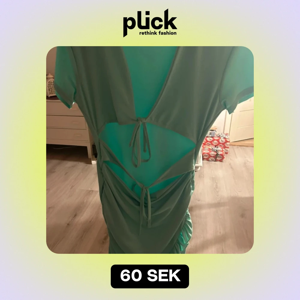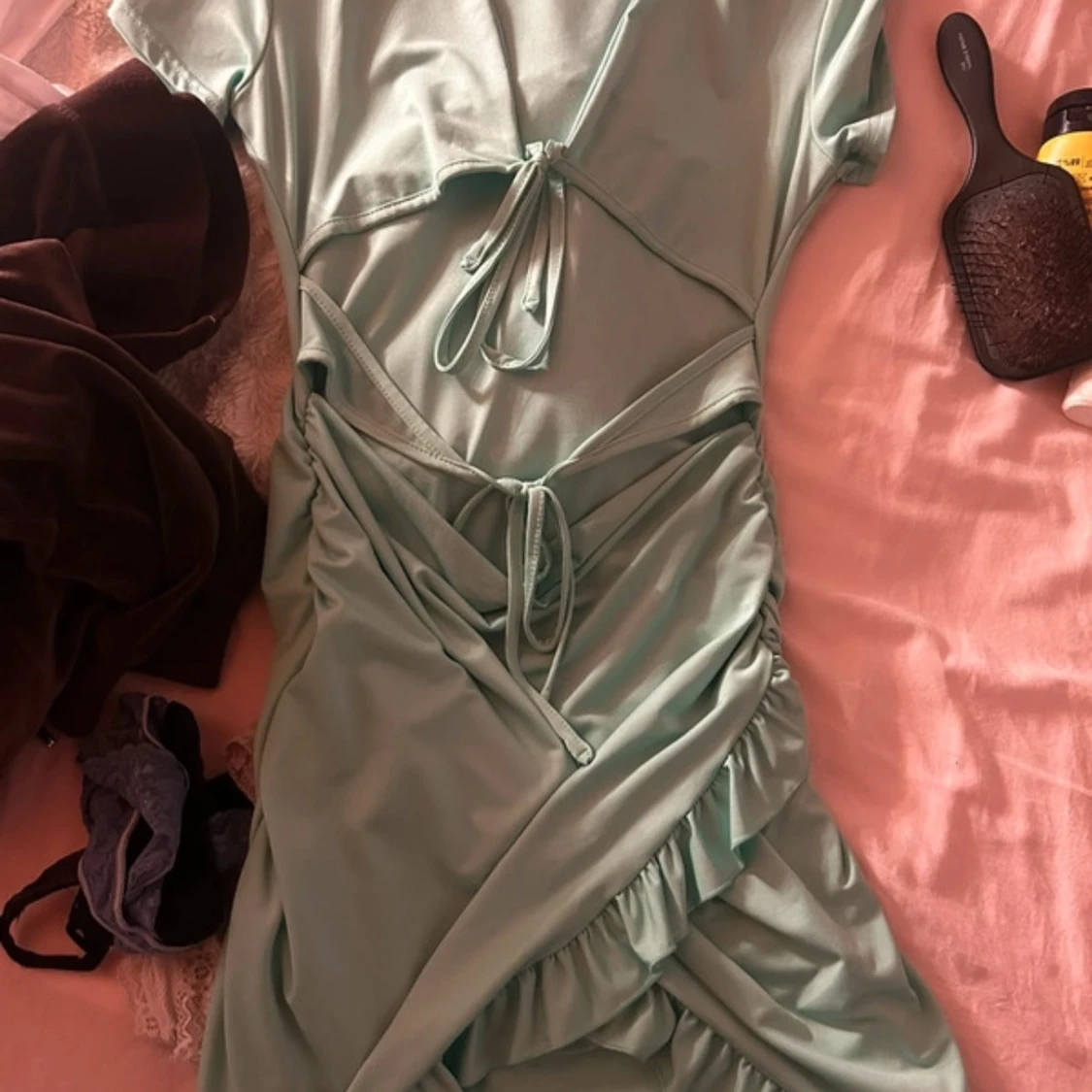 Snygg mintgrön klänning från Shein i ett glansigt material. Den har knytning fram och en cool cut-out design som ger en unik look. Perfekt för sommarens fester eller en utekväll. Klänningen har korta ärmar och en omlottstil med volangdetaljer.