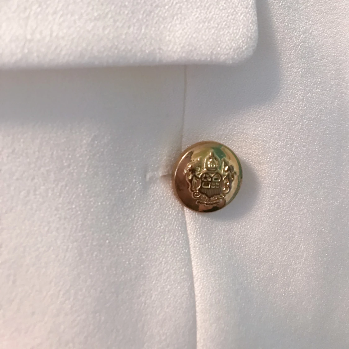 Klänning i blazermodell från MISSGUIDED. V-ringning, långärmad. Vit, dubbelknäppning, guldknappar. Storlek 36. True to size. Kan bäras som off-shoulder. Jättefint skick. Använd en kväll, därefter kemtvättad. Nypris 700:-