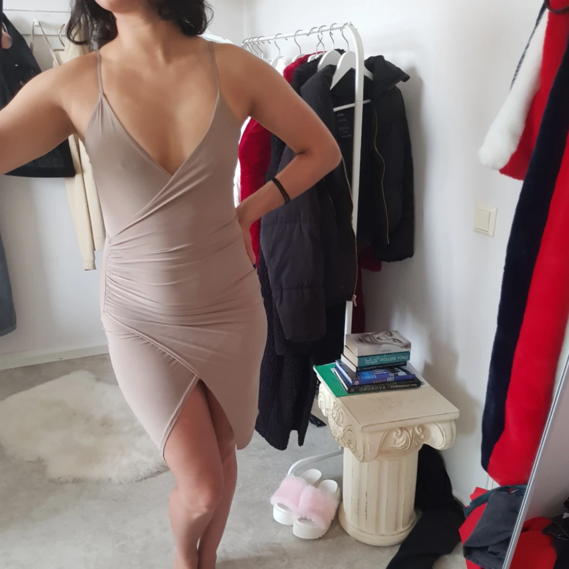 Klänning i hudfärgad ton med främre slits. Använd få gånger och i väl skick. Möts upp i Göteborg. Köparen står för fraktkostnaden.