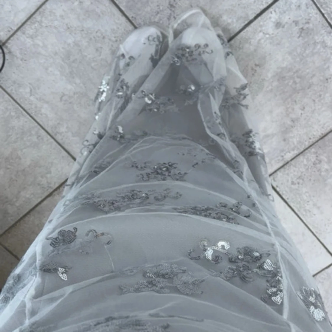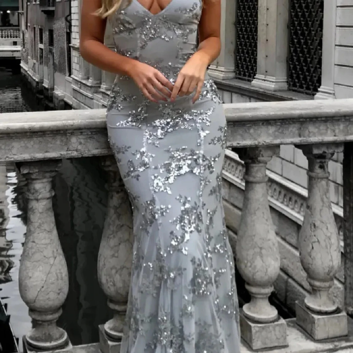 Superfin långklänning med smala axelband, djup v-ringning och öppen rygg med snörning. Klänningen är täckt av glittriga silverpaljetter i blommigt mönster och har en figurnära passform som framhäver siluetten. Perfekt för bal eller festkväll! Aldrig använd. Obs: har inte knutit den bak på min egna bild som den ska vara knuten på egentligen, så är inget fel på den, går och knyta som på originell bild☺️💞