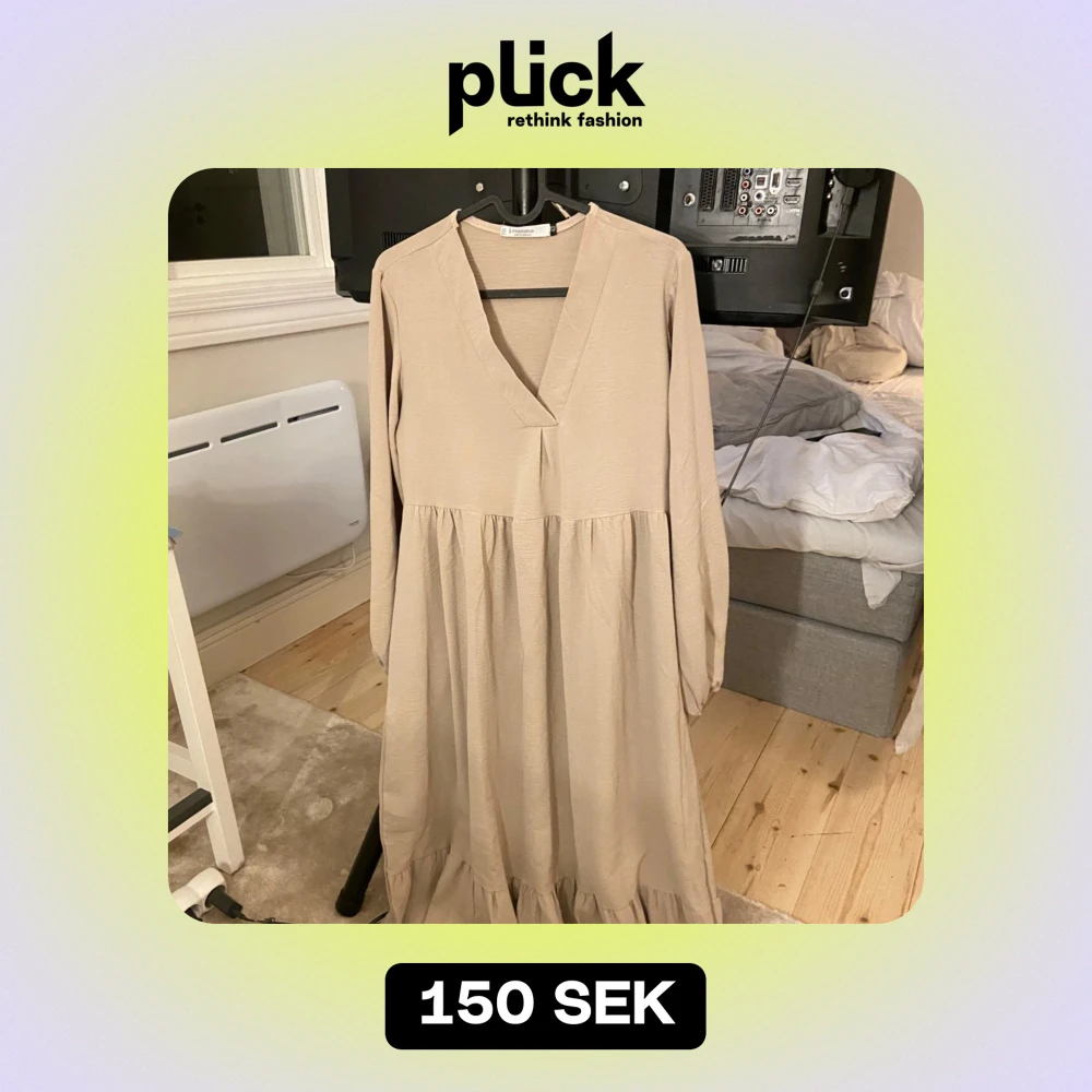 Säljer en superfin beige långklänning med v-ringad hals. Klänningen har långa ärmar och en lös passform som ger en avslappnad look.