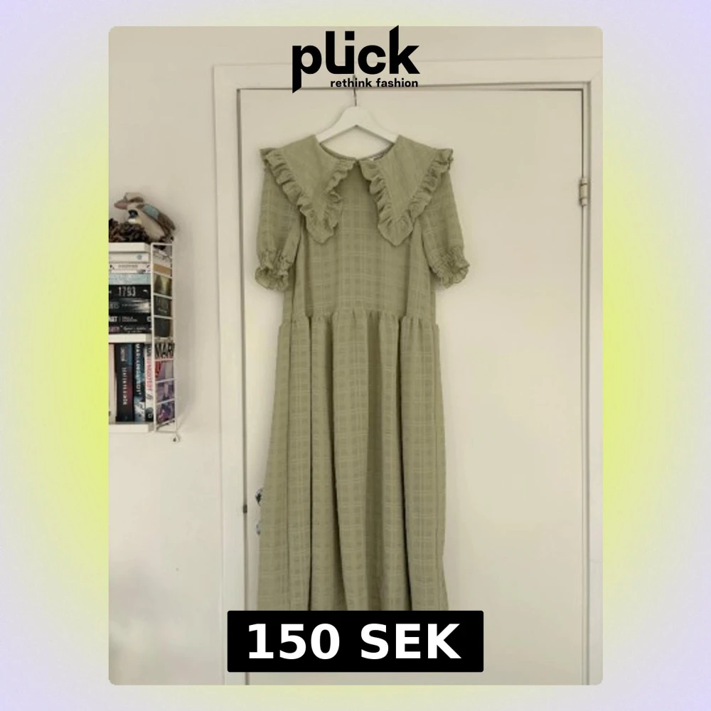 Långklänning från Monki i ljusgrönt med rutigt strukturmönster. Klänningen har stor volangkrage, halvlånga puffärmar med resår och avslappnad passform. Perfekt för dig som gillar romantisk och trendig stil.