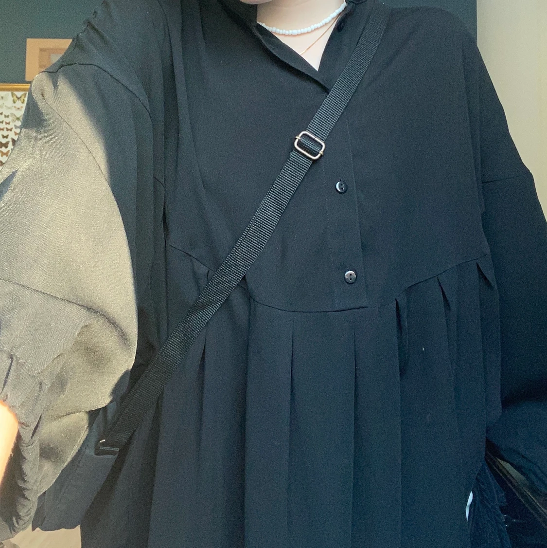 Svart klänning från Monki, köpt här på plick men inte kommit så mycket till användning pga tycker att den sitter lite för oversized på mig. Den är i strl S men passar abs strl M+ självklart beroende på hur man vill att den ska sitta 🥰 Jag brukar ha min Kånken sling till o chunky tofflor :p