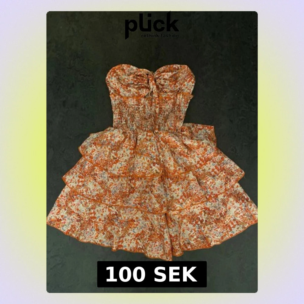 Supersöt axelbandslös kortklänning med volanger och smock upptill. Klänningen har ett orange och vitt blommönster, knyt framtill och flera lager i kjolen för extra volym. Perfekt för varma dagar och somriga vibes. Klänningen är i storlek Xs. Priset går att diskuteras.