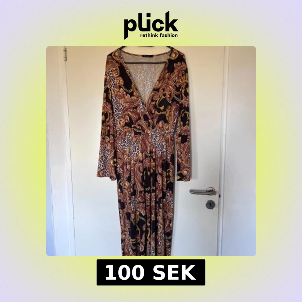 Säljer en maxad jumpsuit från NLY One i storlek XS med v-ringad omlottfront och långa ärmar. Klänningen har ett unikt mönster med leopard och barockinspirerade detaljer i brunt, beige och svart. Materialet är mjukt och stretchigt, perfekt för dig som gillar att sticka ut.