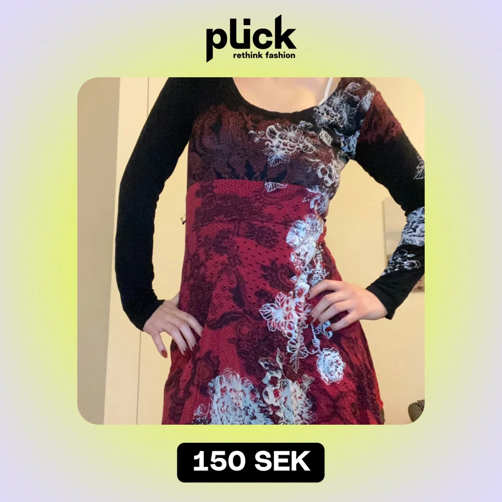 Säljer en super söt klänning från Desigual i rött och svart med blommigt mönster. Den har långa ärmar och är väldigt bekväm! Det står ingen storlek men den är ganska slimmad men endå väldigt stretchig