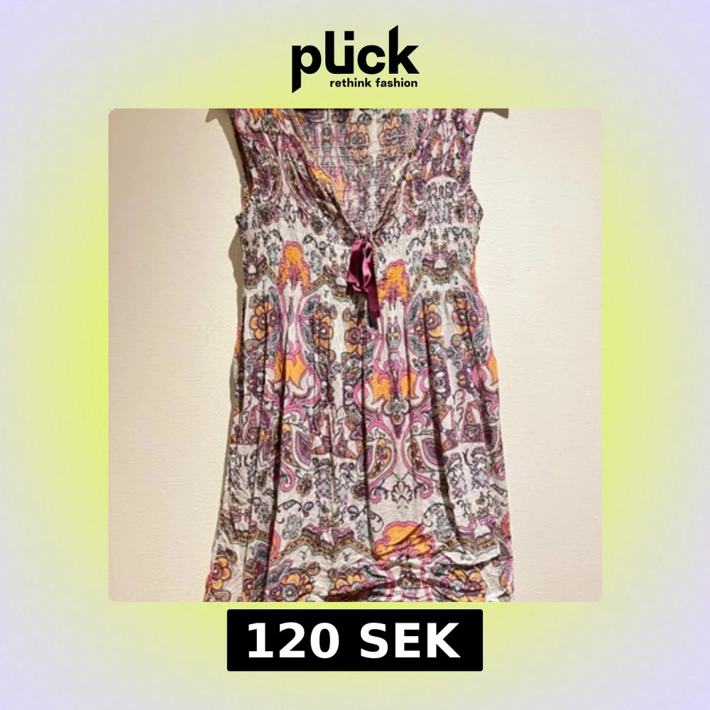Säljer en färgglad klänning från Odd Molly med ett livfullt mönster i rosa, orange och lila toner. Klänningen är ärmlös och har en v-ringad design med knytning framtill. Perfekt för en bohemisk look!