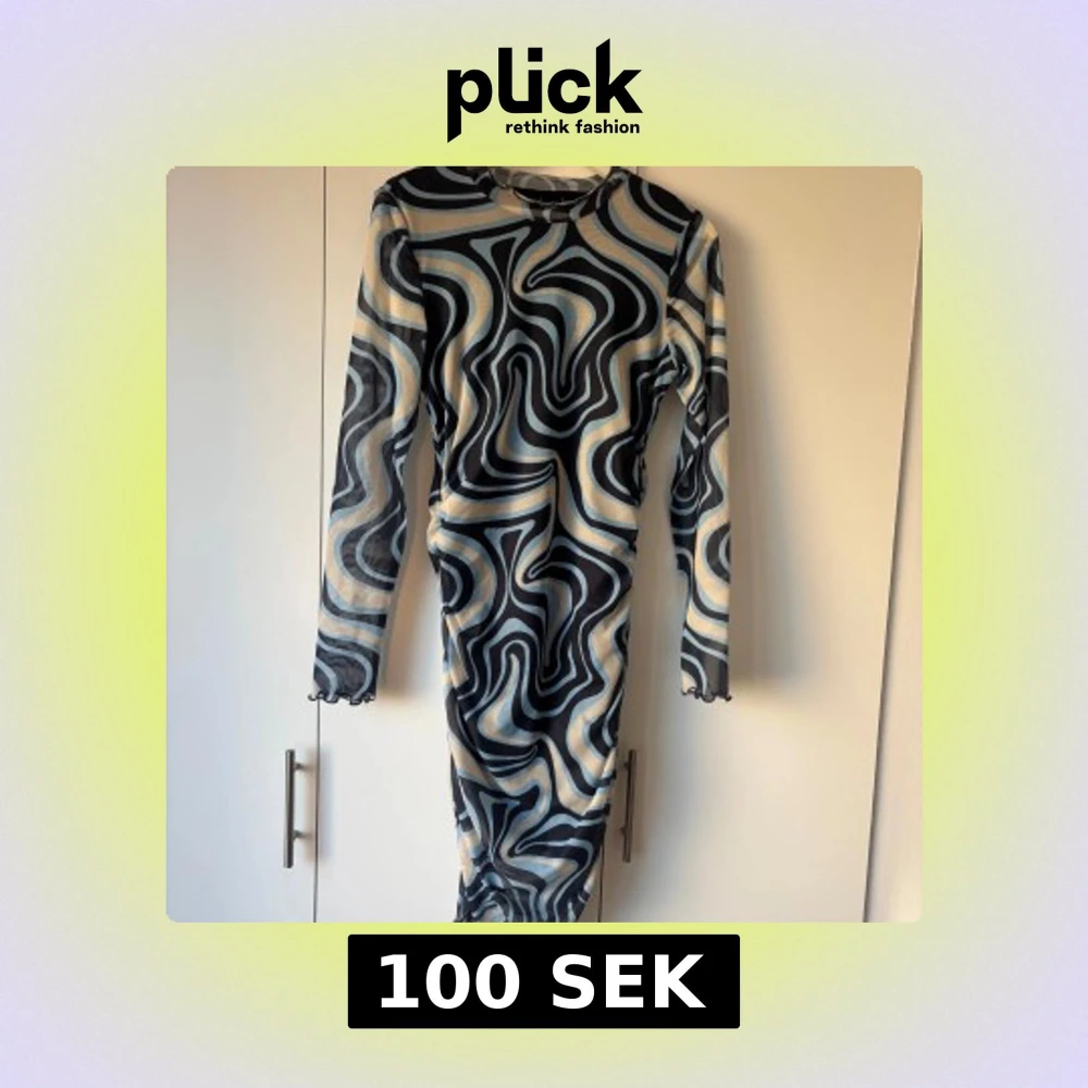 Säljer en långärmad klänning från Vero Moda i storlek M. Klänningen har ett coolt mönster i svart, beige och ljusblått, med tight passform och rynkade detaljer längs sidan