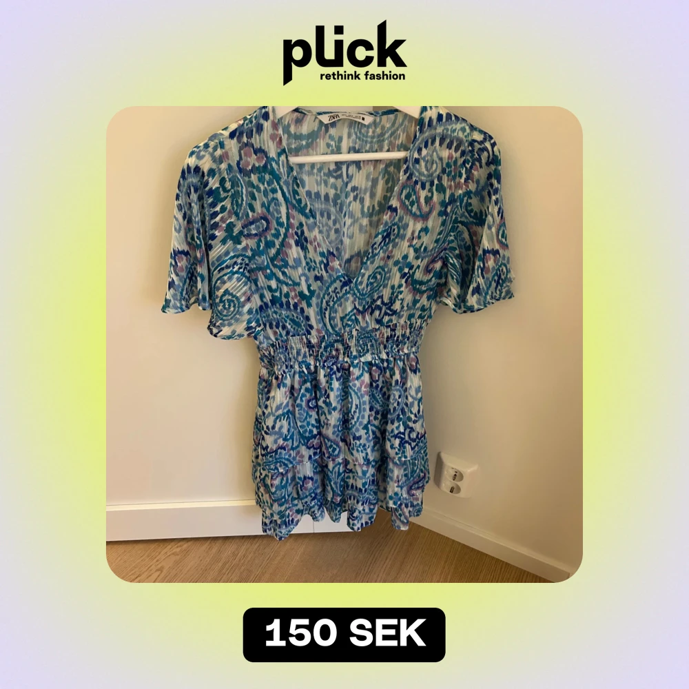 Säljer en superfin mönstrad klänning från Zara i blå och lila toner. Den har en v-ringad design med korta ärmar och ett elastiskt band i midjan för en smickrande passform. Perfekt för sommarens alla tillfällen! 🌸