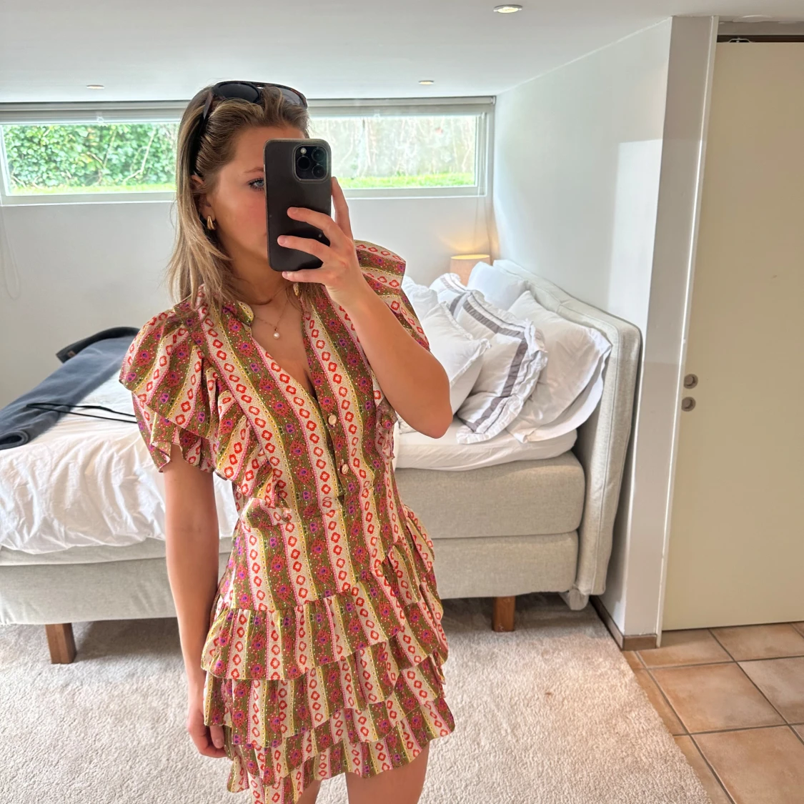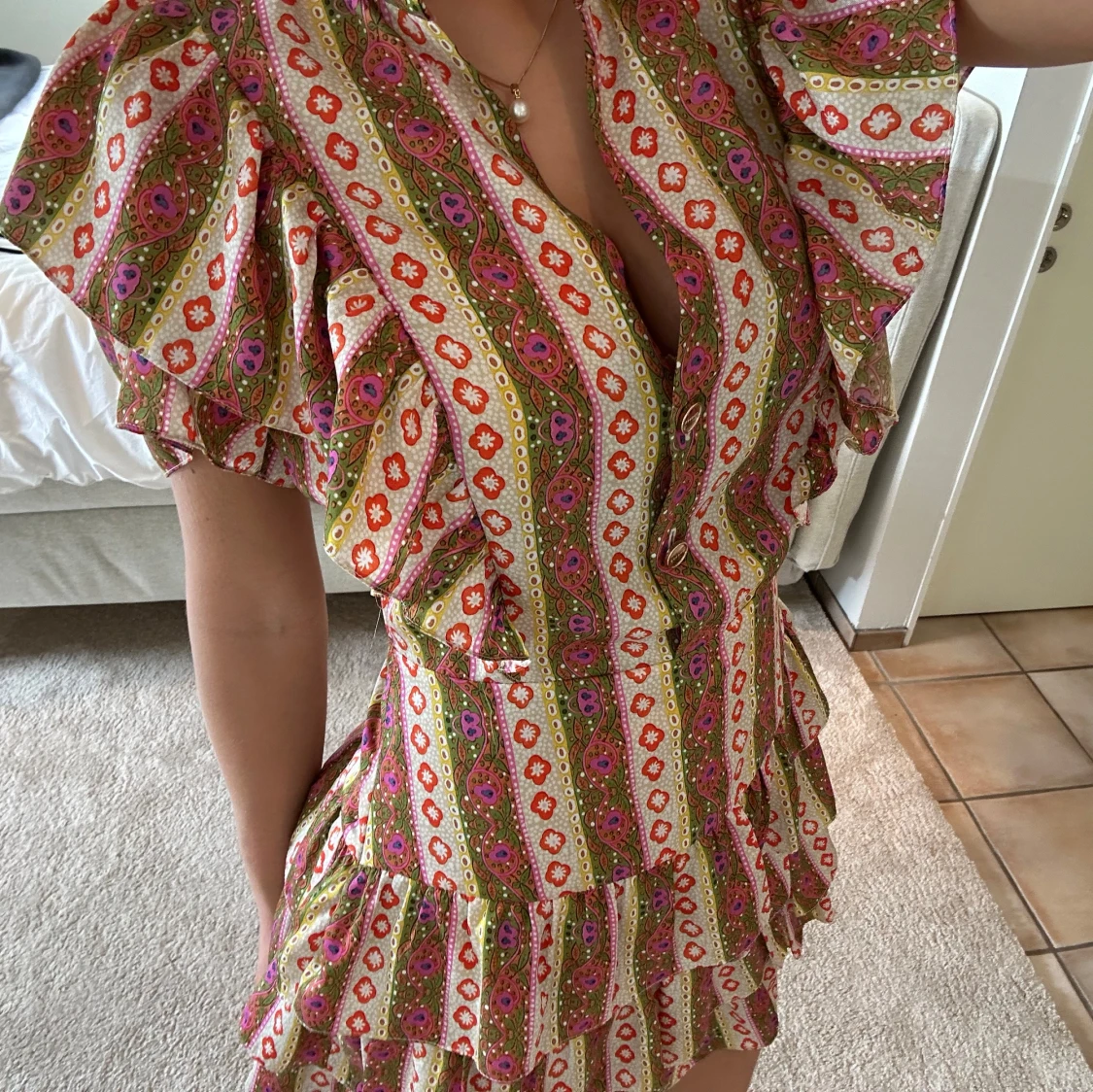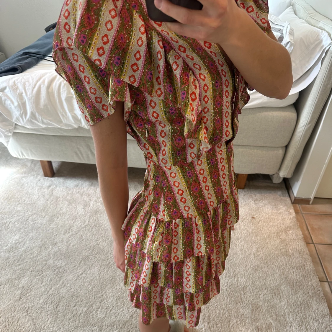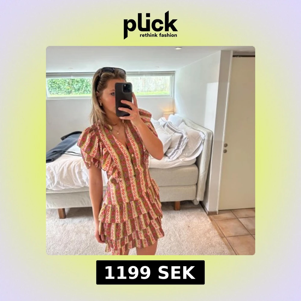 Säljer världens finaste mönstrade klänning från Sandro! Den är köpt i en fransk storlek 42 och är efter detta insydd smått vid midjan så skulle säga att den passar mer en 38. Såå så fin passform! 🩵