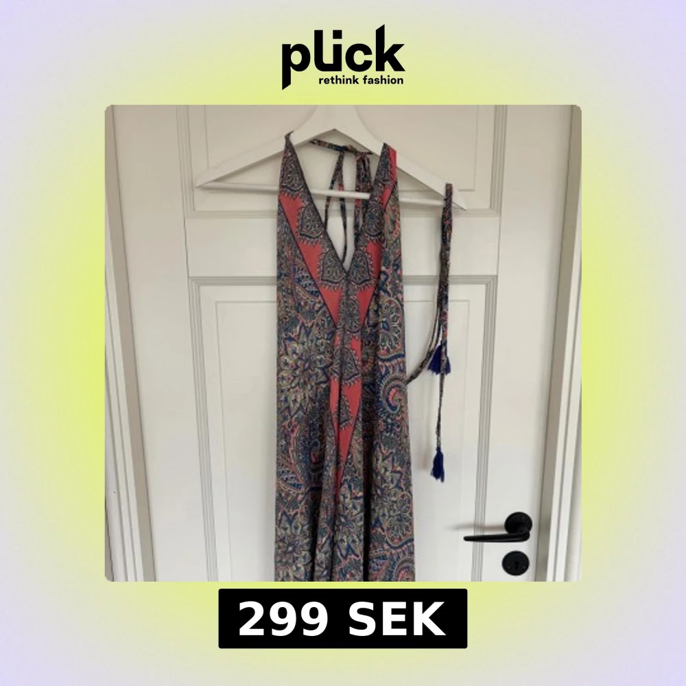 Snygg kortklänning från Addictive Tropezian Collection med paisleyinspirerat mönster i blått, rosa och beige. Klänningen har halterneck med knytband och dekorativa blå tofsar. Luftigt material, perfekt för varma dagar. Jag köpte den i samma butik som den gröna kjolen som ligge ruppe på min plick. Den är aldrig använd och har lappen kvar. Den har ingen storlek men passar mig som är xs/s