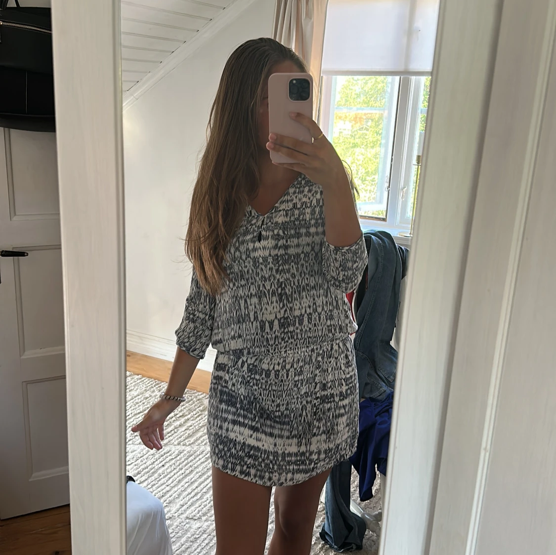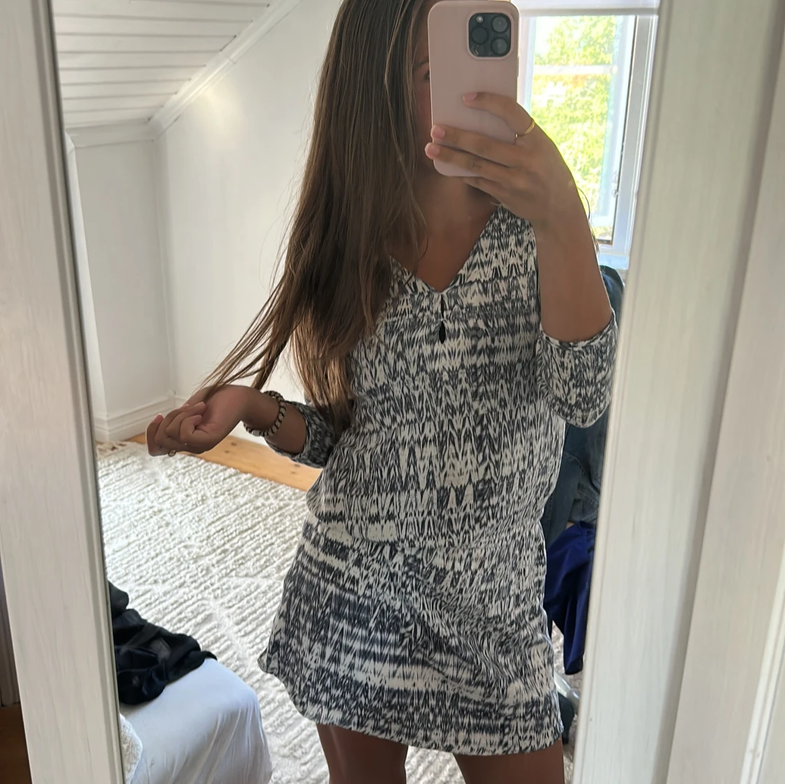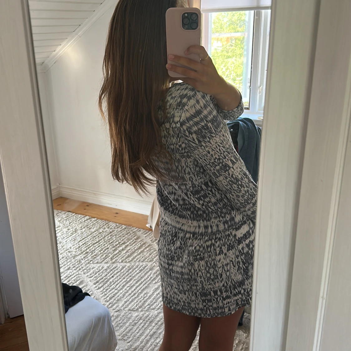 Supersnygg kortklänning med svartvitt mönster och v-ringning. Klänningen har långa ärmar och resår i midjan för en skön passform. Perfekt för dig som gillar en avslappnad men trendig stil.