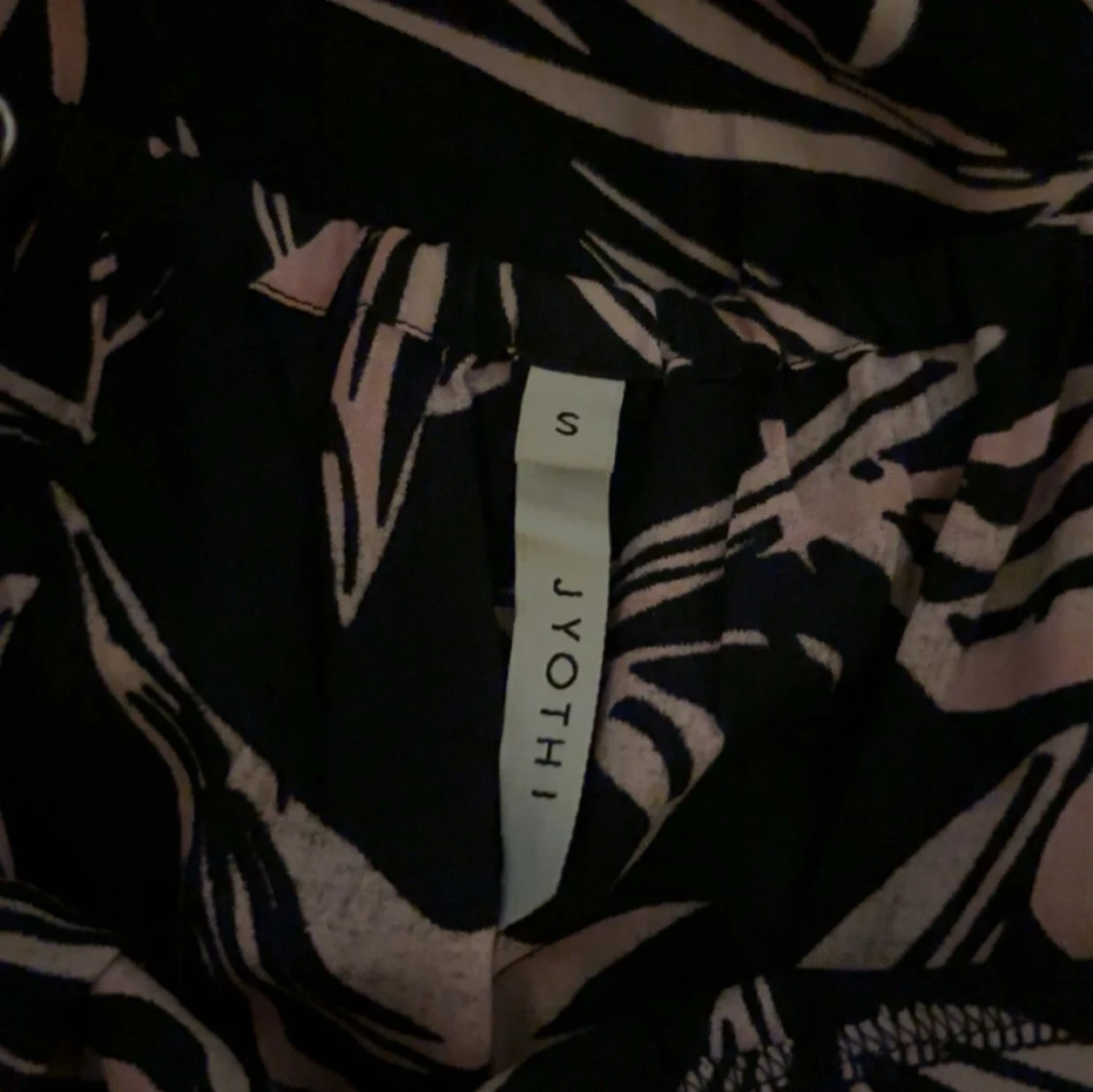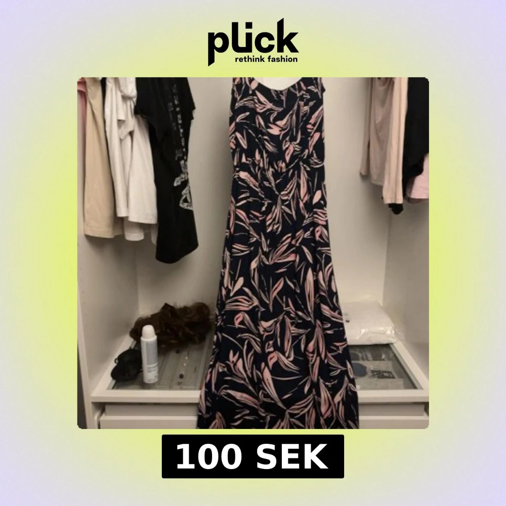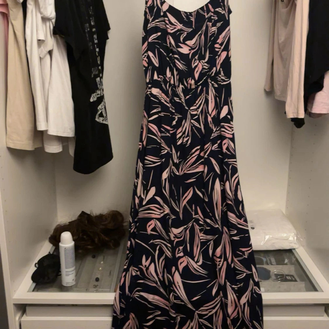 Snygg långklänning från Jyothi med marinblå bas och rosa bladliknande mönster. Klänningen har smala axelband desig, perfekt för en somrig look. Lätt och flowy känsla som ger en avslappnad men ändå stilren vibe. Säljer då jag tycker om mer korta klänningar än långa och gör att denna inte kommer så mycket till användning.