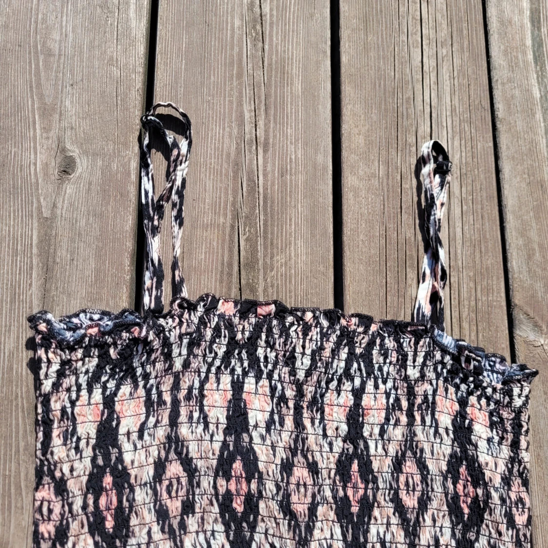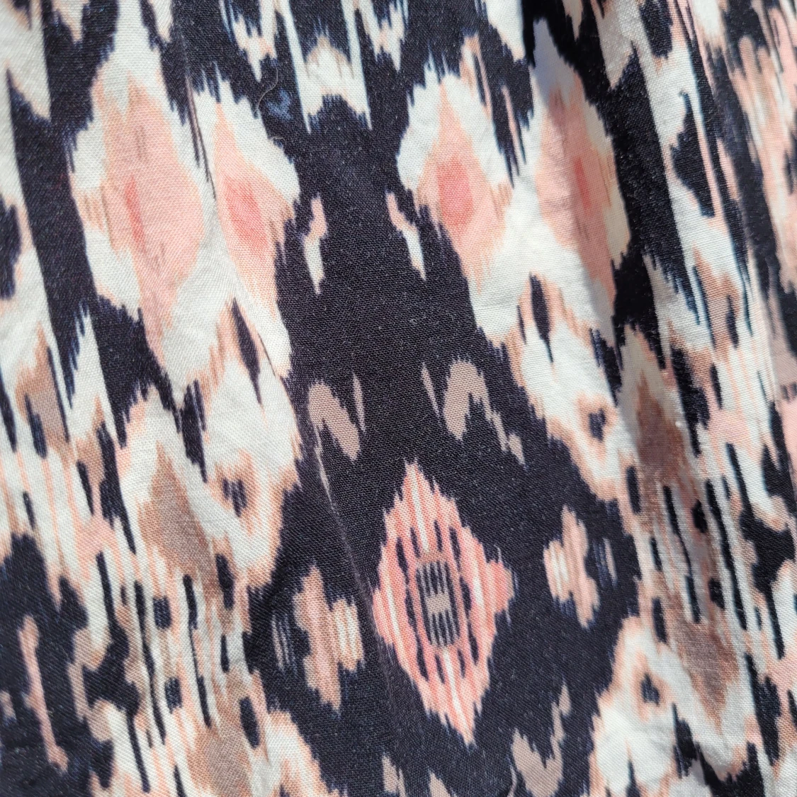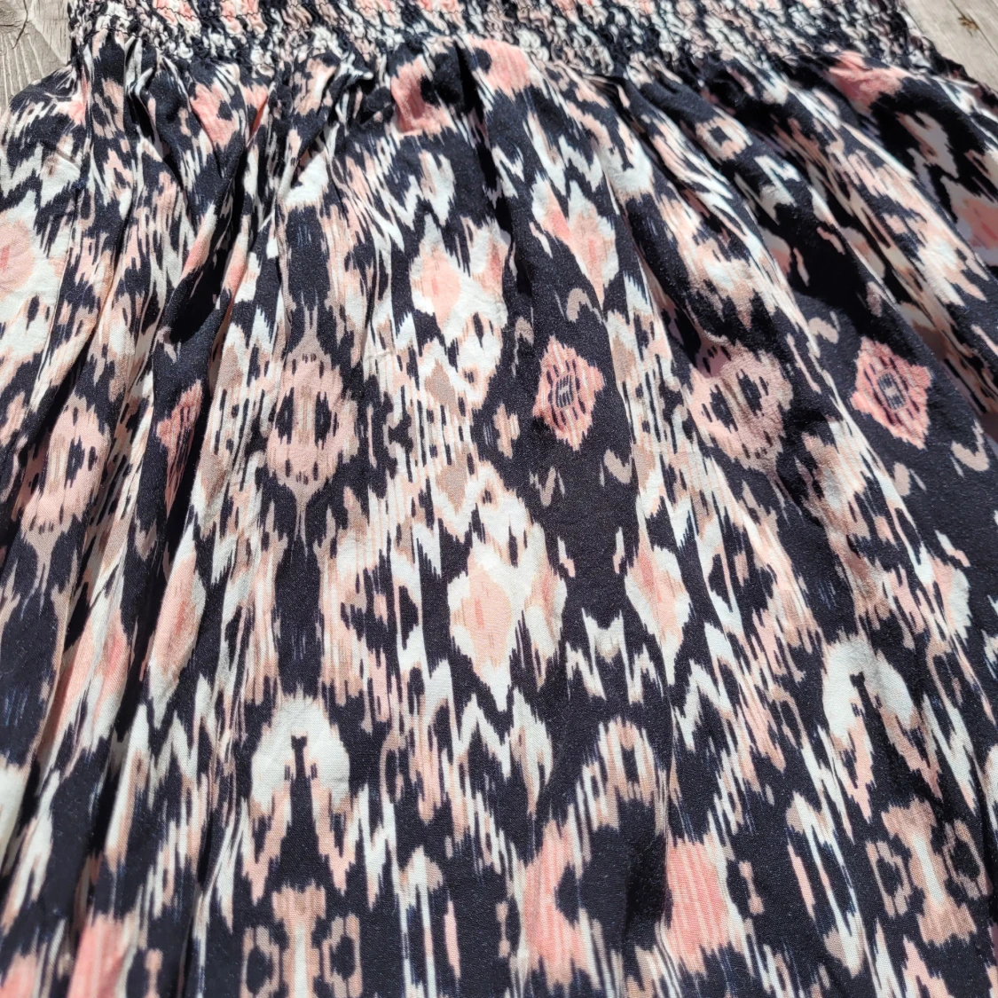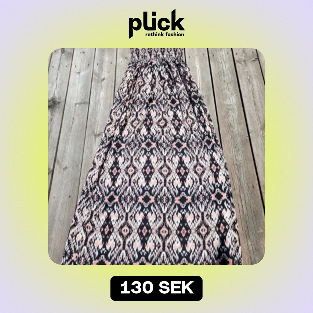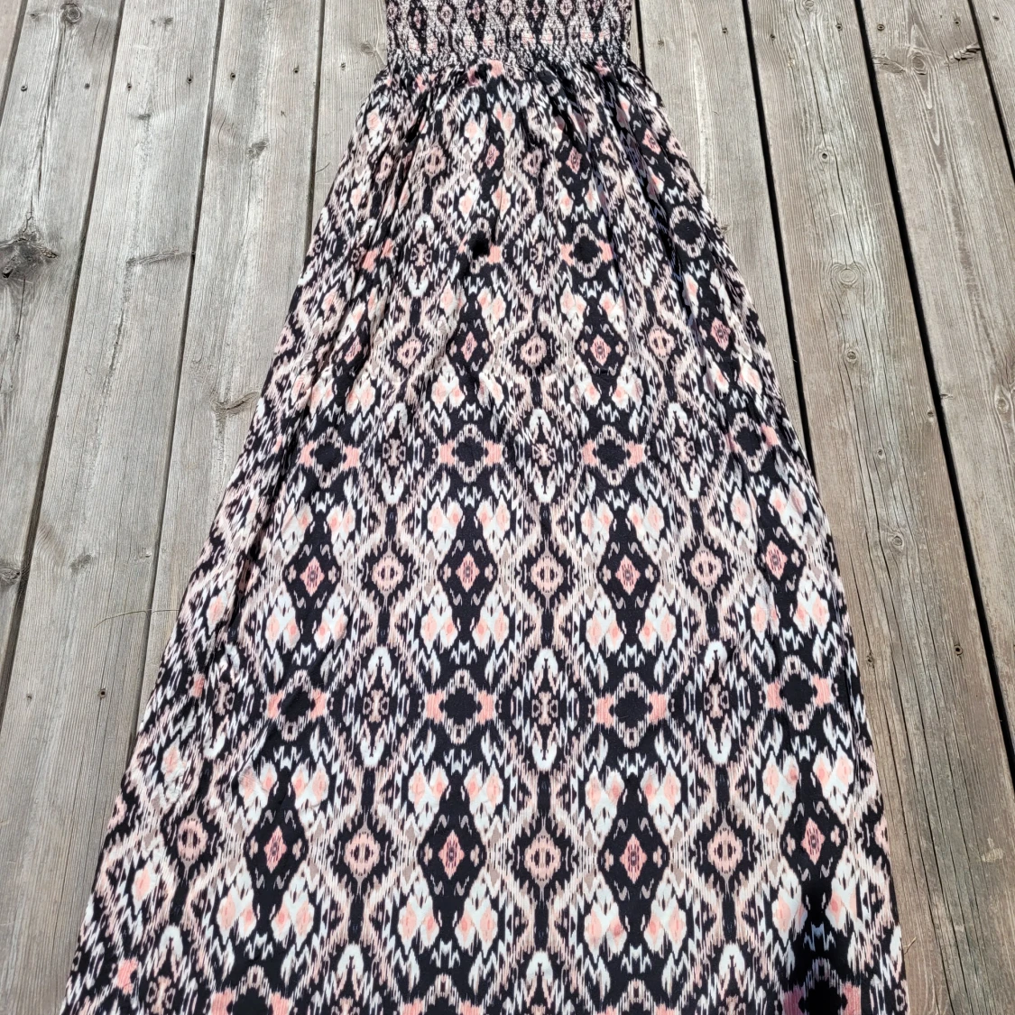 En mönstrad långklänning med smala axelband. Klänningen har ett elastiskt livstycke och ett flödande kjolparti. Mönstret består av geometriska former i svart, rosa och beige. Aldrig använd.
