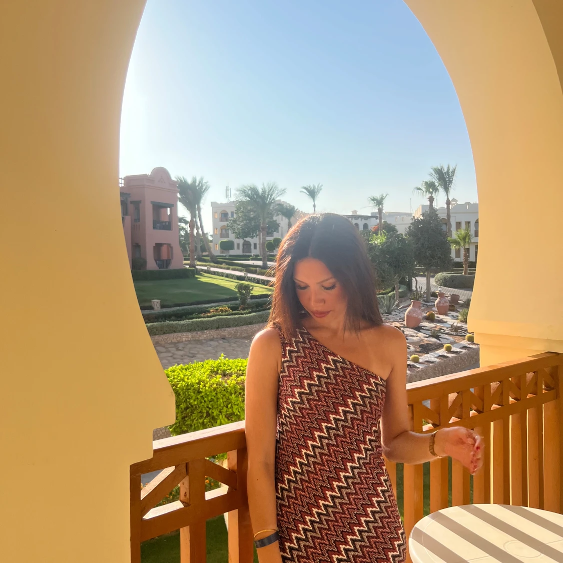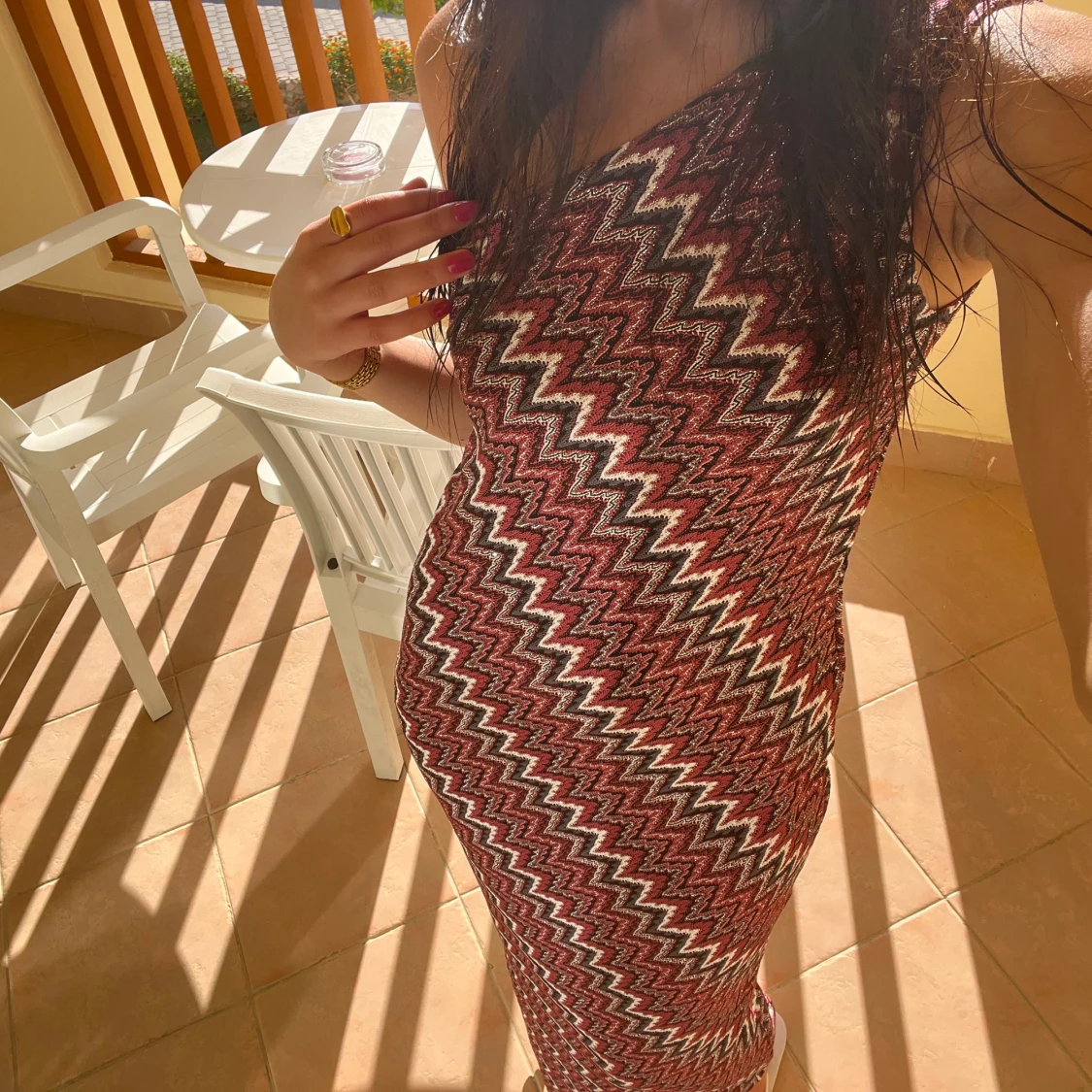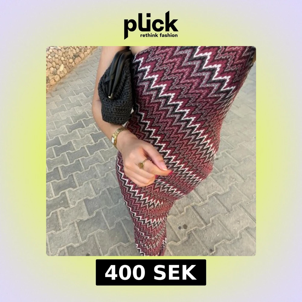 Säljer en lång, figurnära oneshoulder-klänning med snyggt zickzackmönster i vinrött, svart och vitt. Klänningen har en cool asymmetrisk axel och är perfekt för dig som vill sticka ut. Materialet känns mjukt och följsamt mot kroppen.