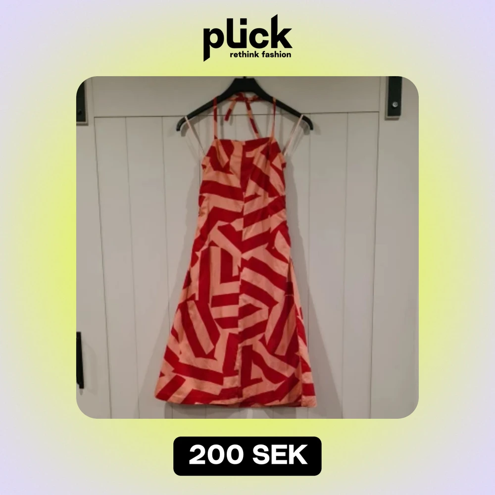 Säljer en snygg röd och rosa klänning med ett geometriskt mönster. Klänningen har rosa foder och smala axelband och en halterneck-stil.