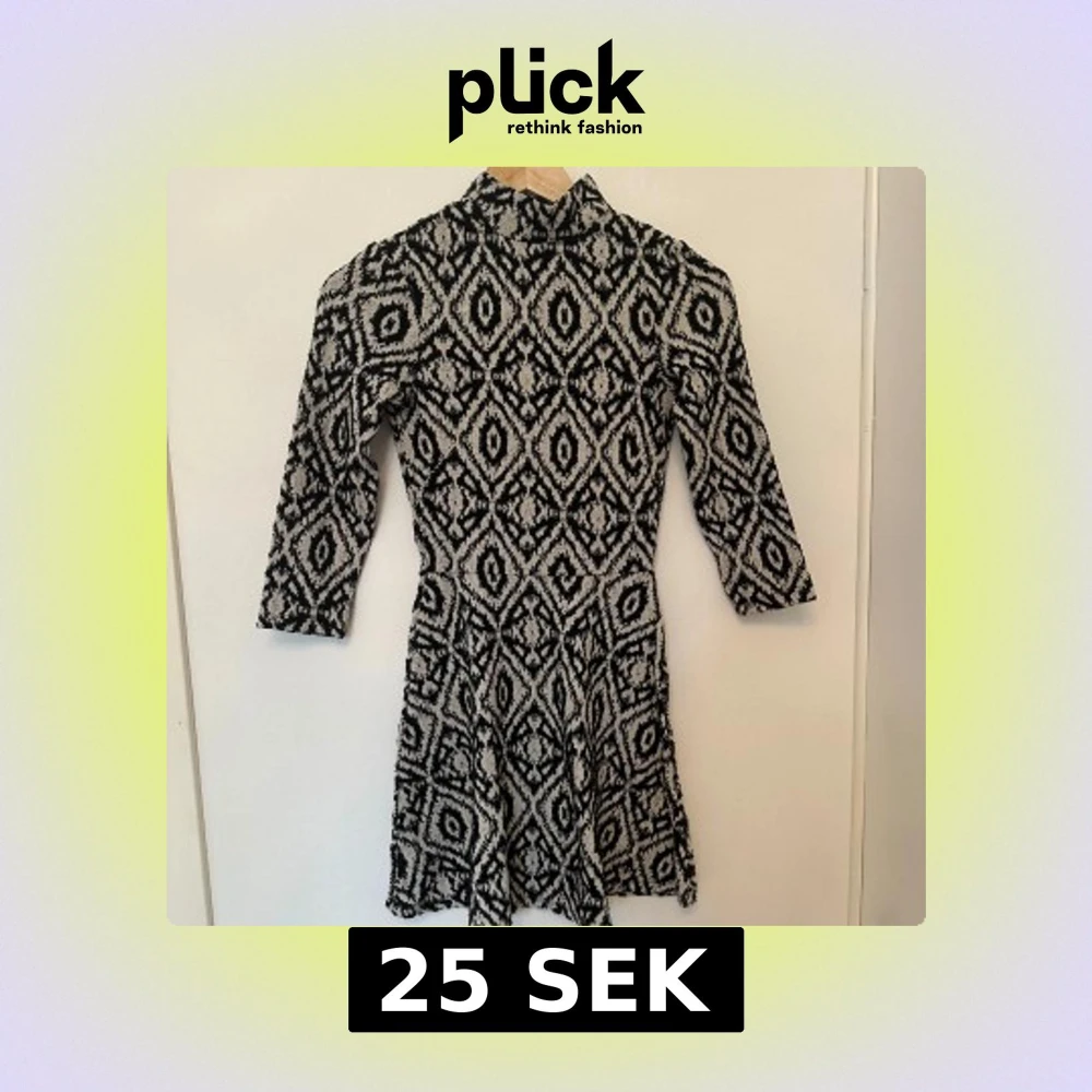 Snygg svartvit klänning med geometriskt mönster. Den har trekvartsärmar och en hög krage, vilket ger en stilren look.