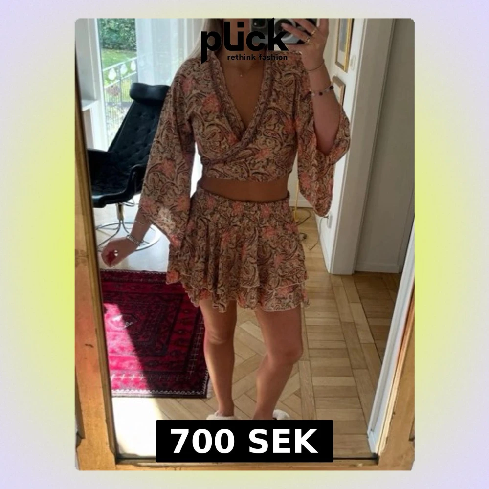 Otroligt set från Laraethnics, köpt i en liten butik i St Tropez. Står ingen storlek men uppskattar till S, men passar nog både XS och M också. Toppen kan man knyta på två olika sätt (jämför bild 2 och 3).