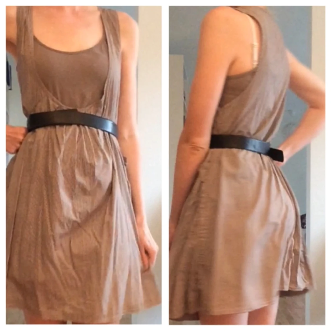 Beige klänning i två delar (underklänning och överklänning). Vid i modellen men passar bra med ett skärp i midjan. Strl 34/36. Köparen står för eventuell fraktkostnad och betalning görs via swish.