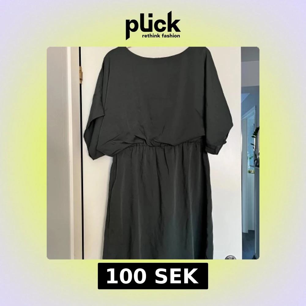Elegant mörkgrå/grön klänning från Bubbleroom med en lös passform och kortärmad design. Klänningen har en rund halsringning och en diskret dragkedja i ryggen för enkel påklädning. Perfekt för en stilren look.