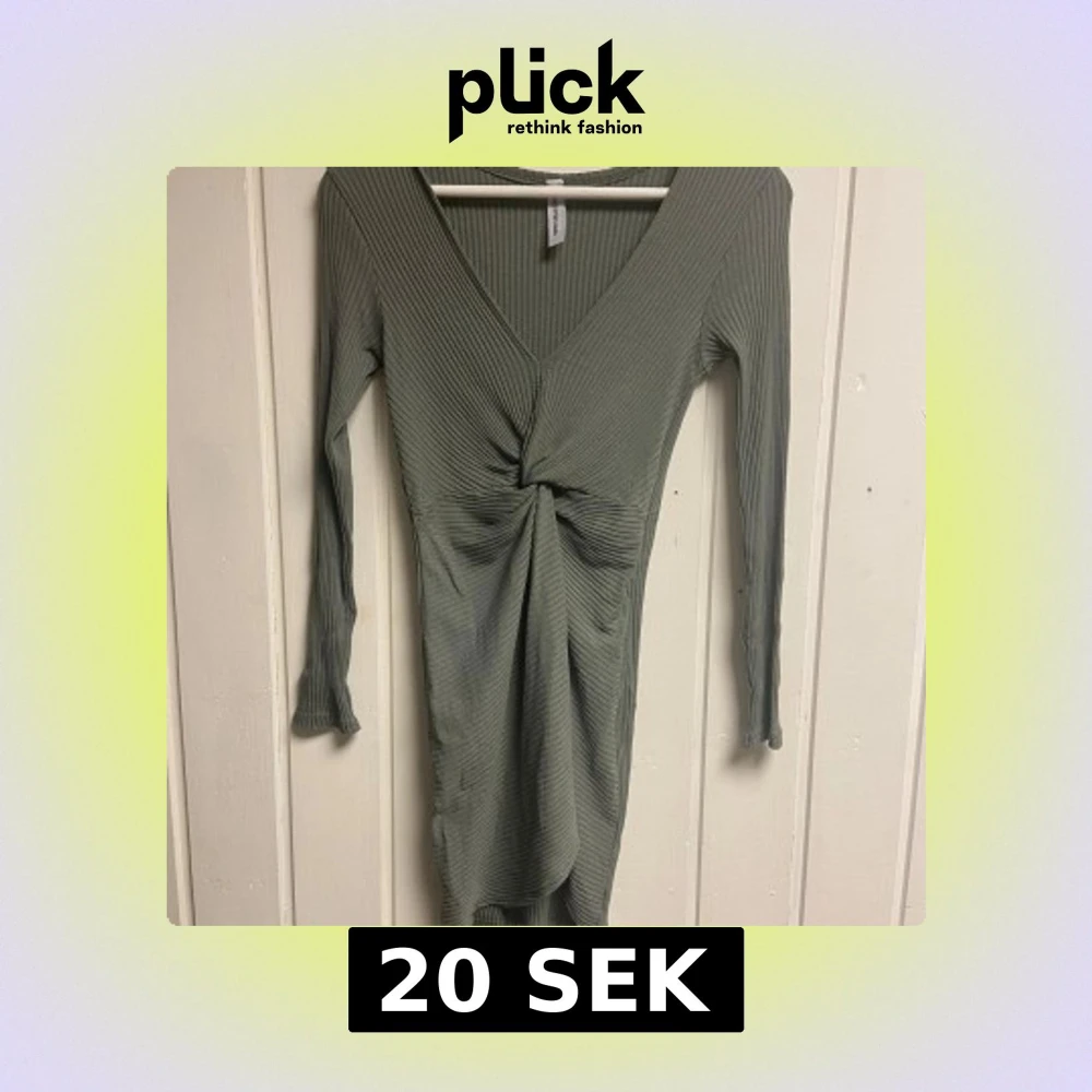 Grön ribbad klänning med v-ringning och knutdetalj framtill.