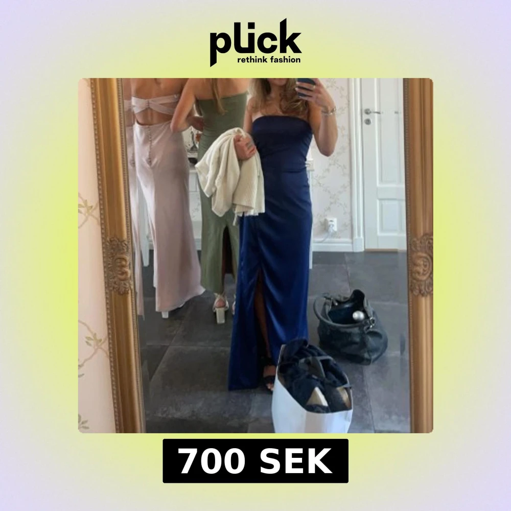 Elegant mörkblå axelbandslös klänning med en smickrande slits framtill. Klänningen har en lång, flytande design som ger en sofistikerad look. Endast använd vid ett tillfälle och det var balen.