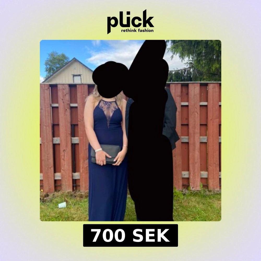 Elegant mörkblå långklänning med spetsdetaljer vid halsen. Klänningen är ärmlös och har en figurnära passform som ger en stilren siluett. Perfekt för formella tillfällen. Är i strl 40 men passar M utan problem!