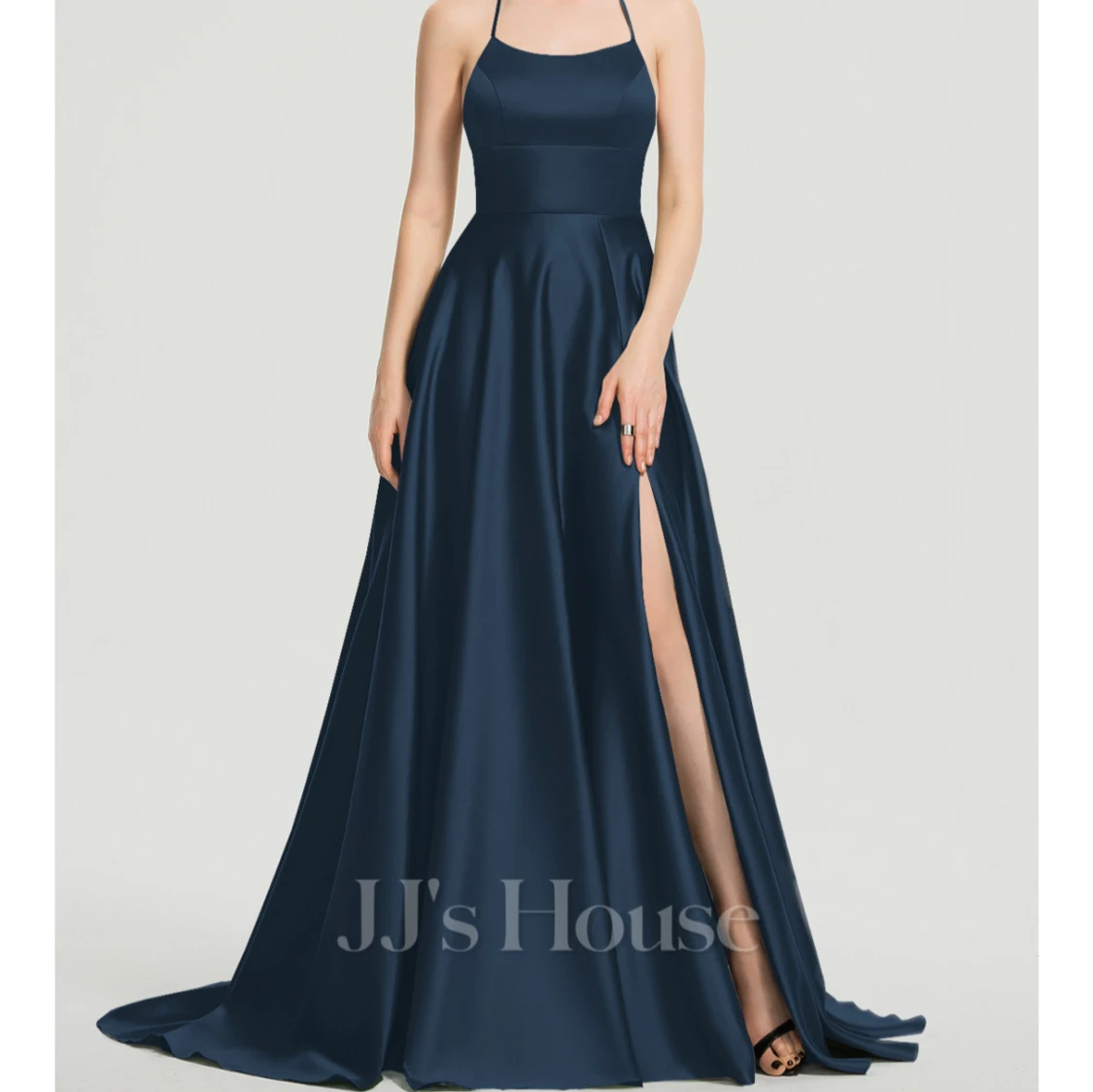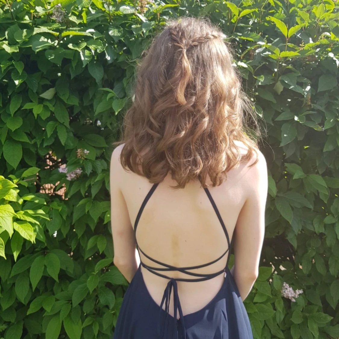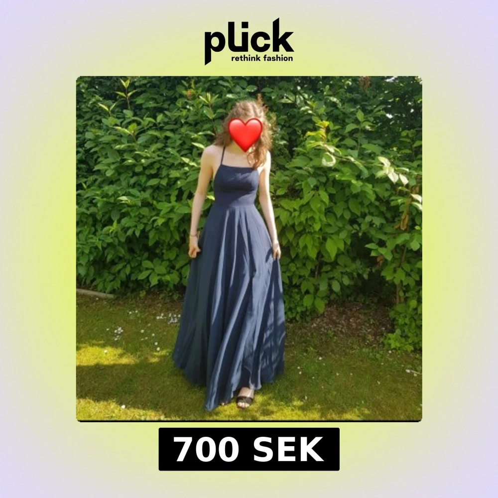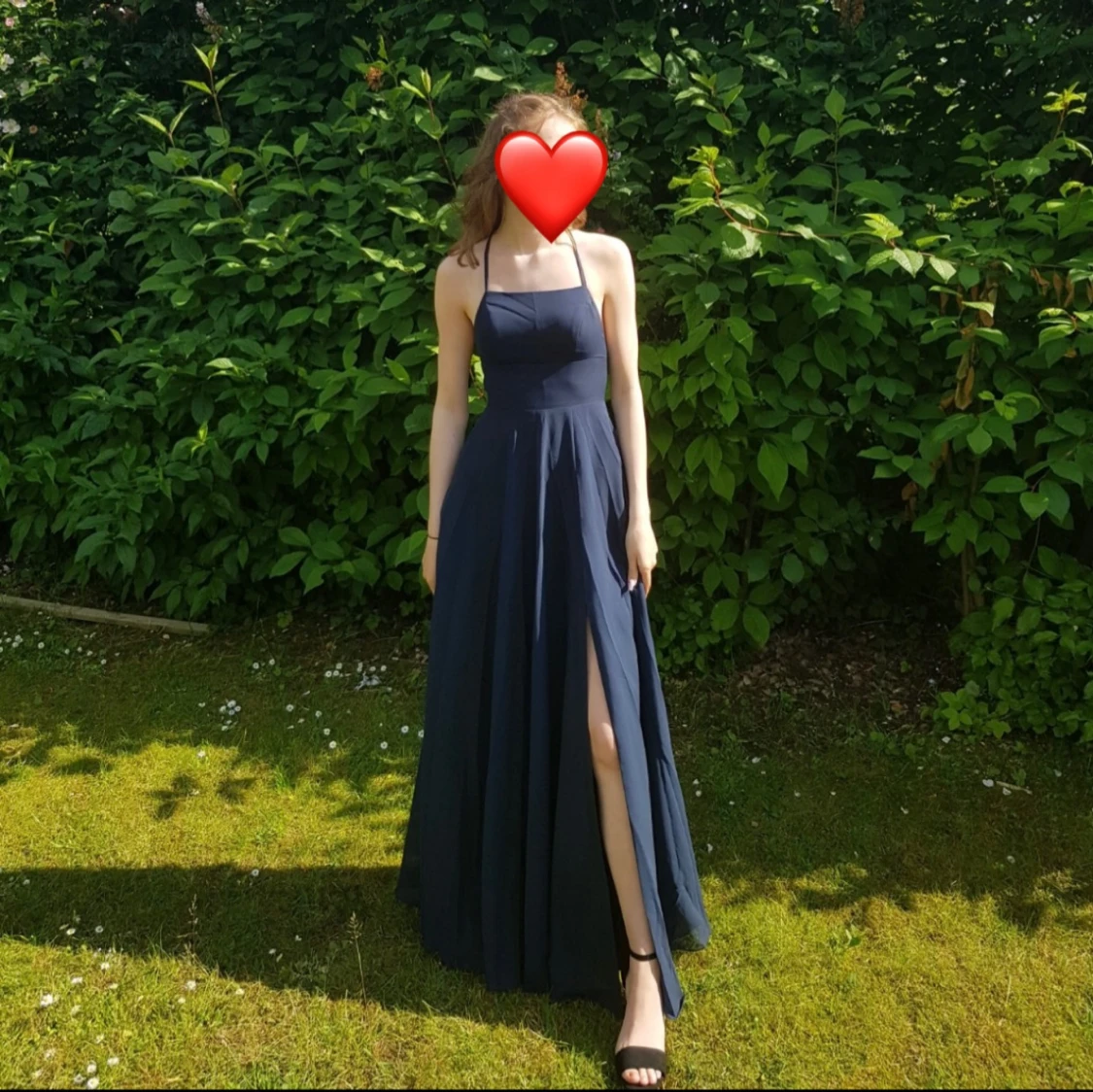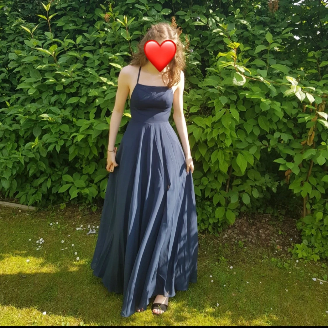Mörkblå balklänning med en slits framtill. Den har en öppen rygg med snörning. Perfekt längd med klackar för mig som är 172cm. Endast använd en gång, original pris 1486kr. Storlek 32, men passar större också.
