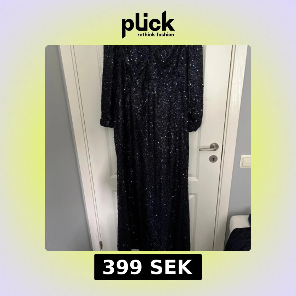 Säljer en mörkblå långklänning med glittriga paljetter. Klänningen har långa ärmar och en elegant, figurnära passform. Perfekt för festliga tillfällen när du vill sticka ut och glänsa.
