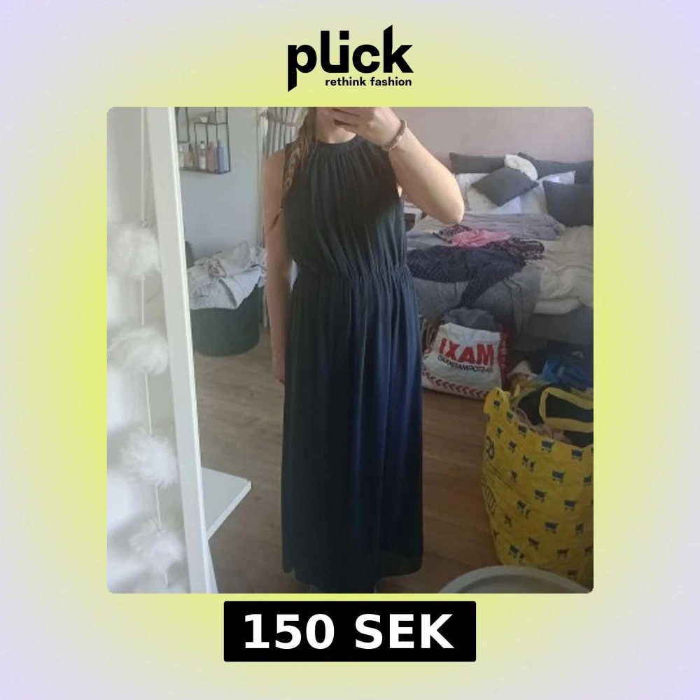 Marinblå balklänning / långklänning med rund halsringning och ärmlös design. Väldogt sparsamt använd så i fint skick! Den är från H&M i storlek 36 motsvarar ungefär S
