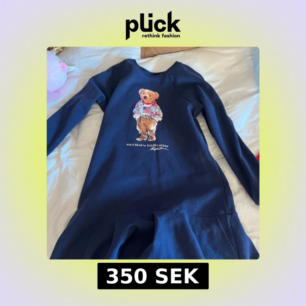Säljer en mörkblå klänning från Polo Ralph Lauren med en söt björn på framsidan. Klänningen har långa ärmar och en avslappnad passform. Perfekt för en mysig dag.