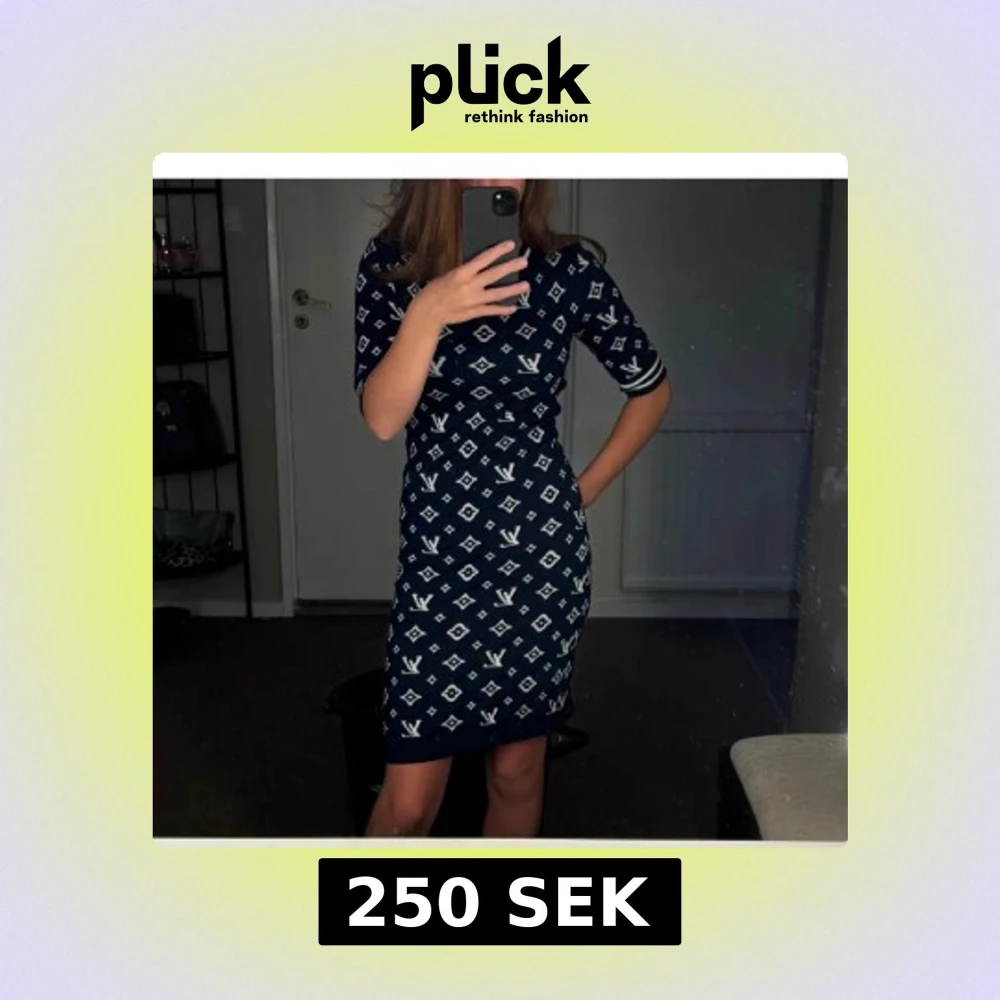 Snygg mörkblå klänning med ett vitt geometriskt mönster. Klänningen har trekvartsärmar och en figurnära passform som framhäver silhuetten. Perfekt för en stilren look.