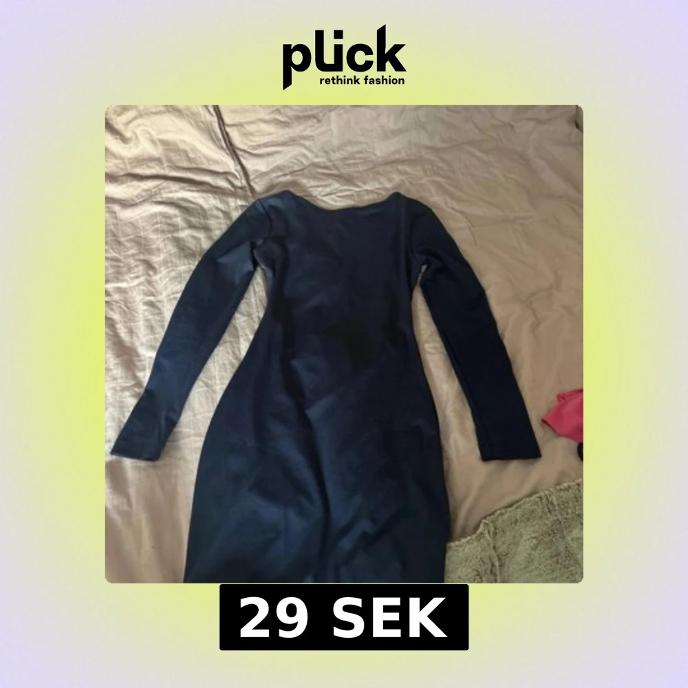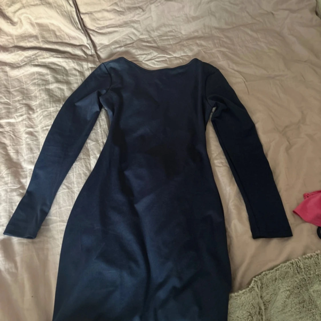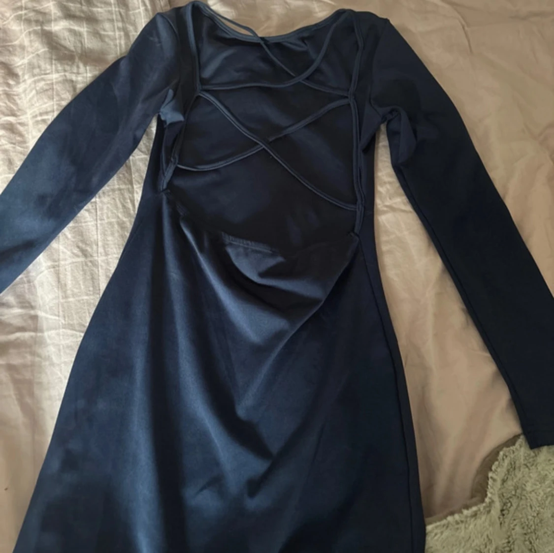 Säljer en mörkblå, figurnära klänning med långa ärmar och snygg snörningsdetalj på ryggen. Klänningen har en enkel, stilren design och är perfekt för dig som gillar minimalistiska plagg med en twist. Materialet känns mjukt och stretchigt.
