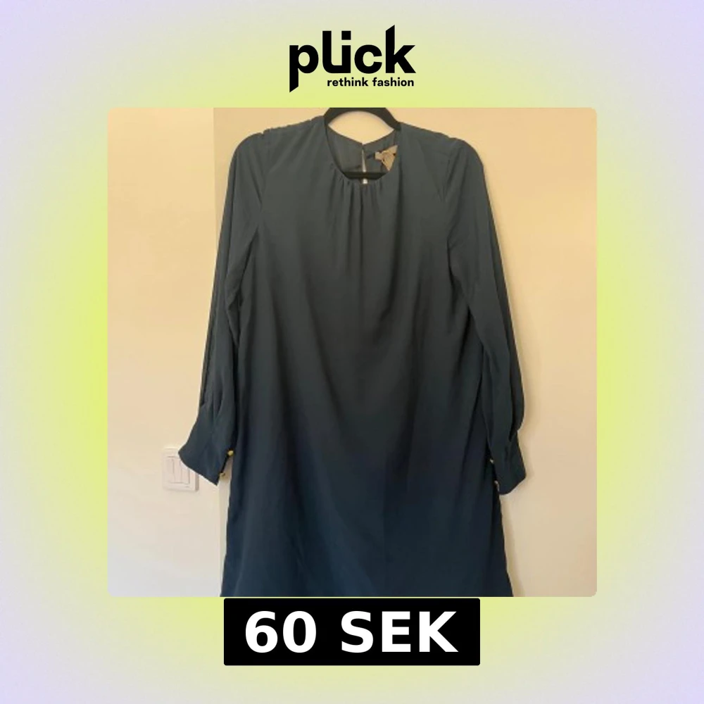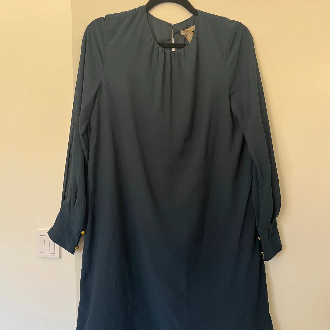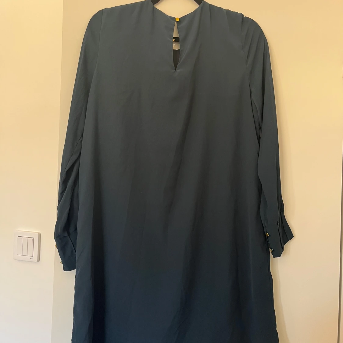 Enkel och stilren mörkblå klänning med lång ärm och rund halsringning. Klänningen har en rak passform och knappar i guld vid ärmsluten som snygg detalj.