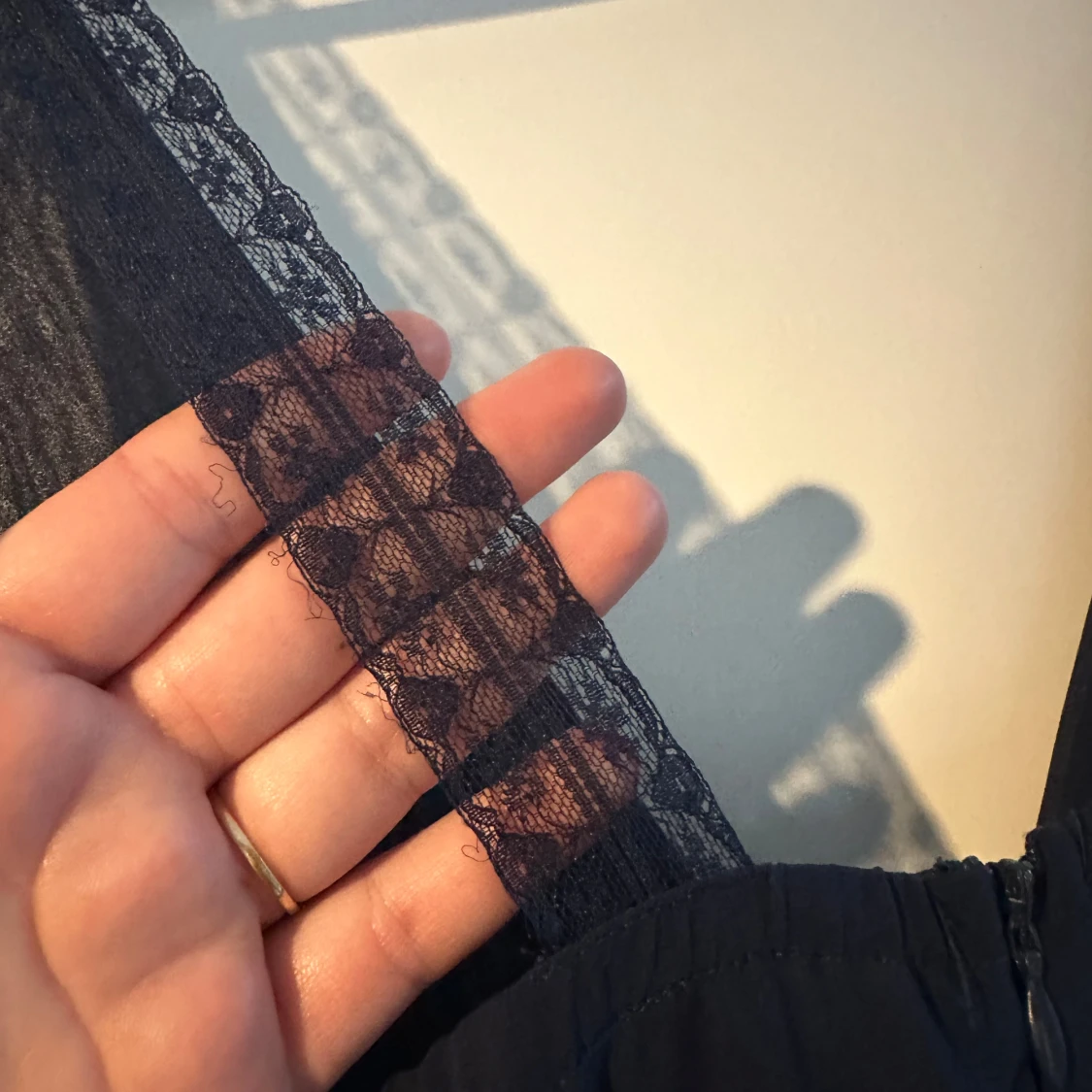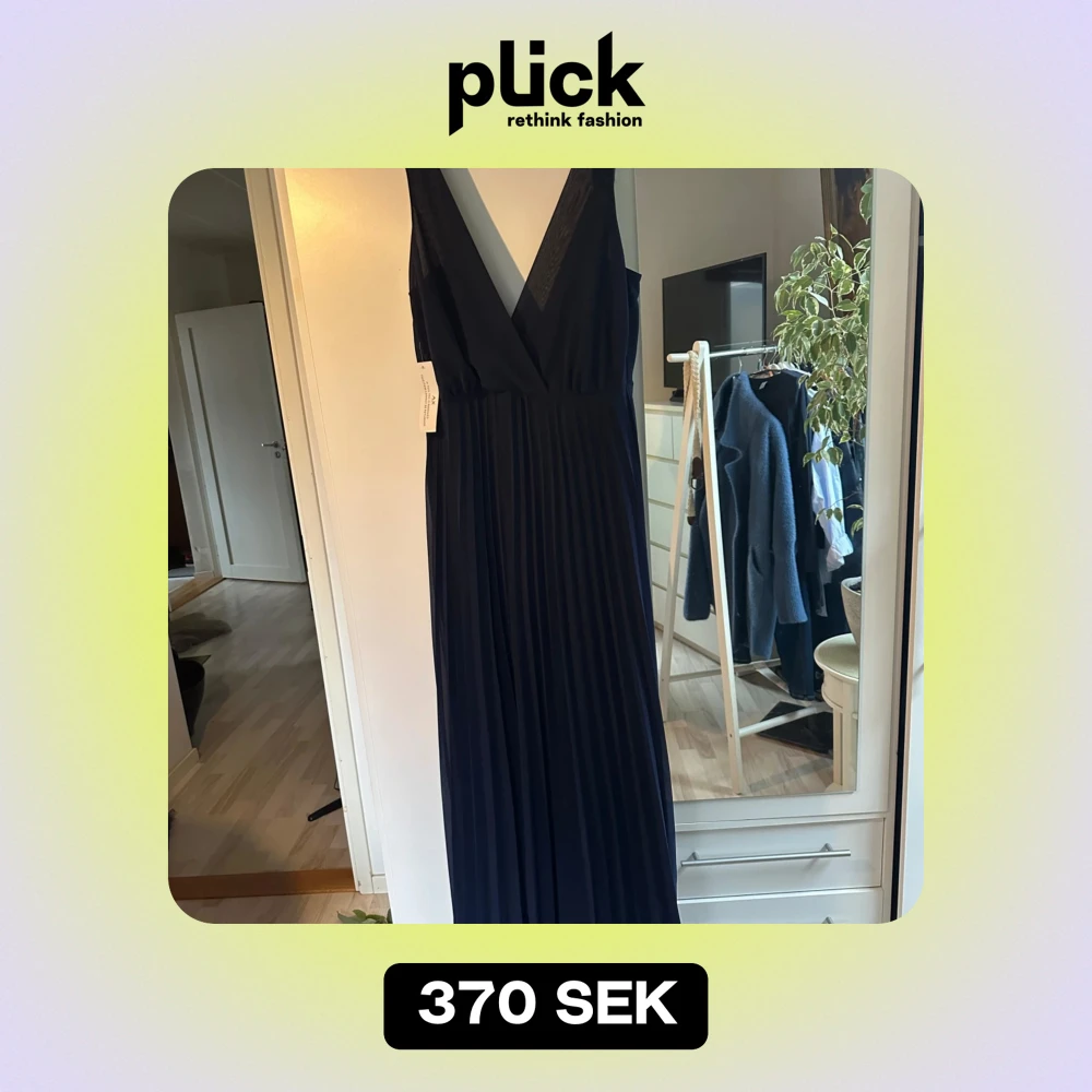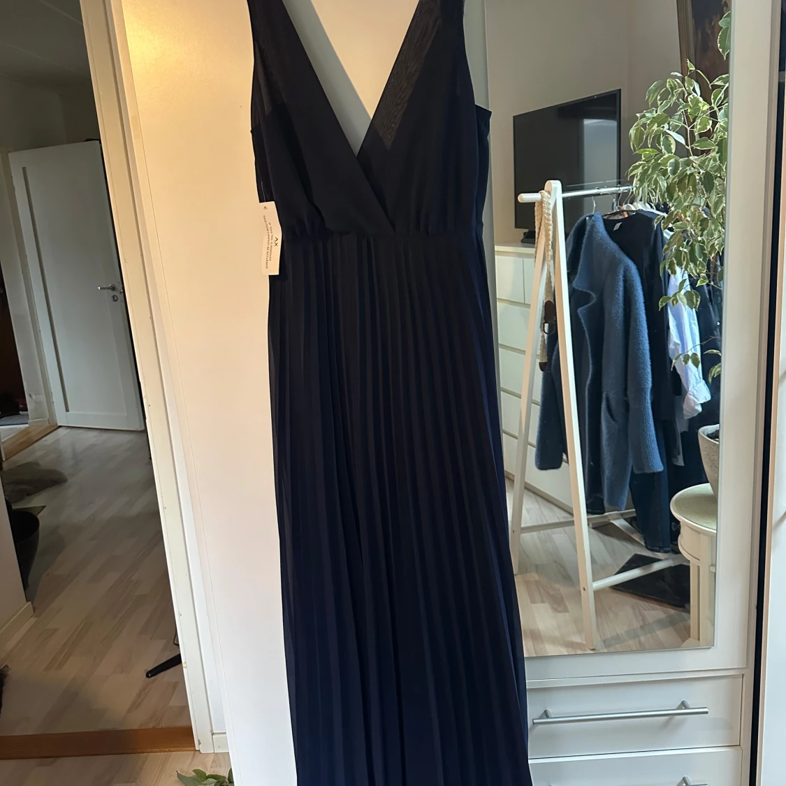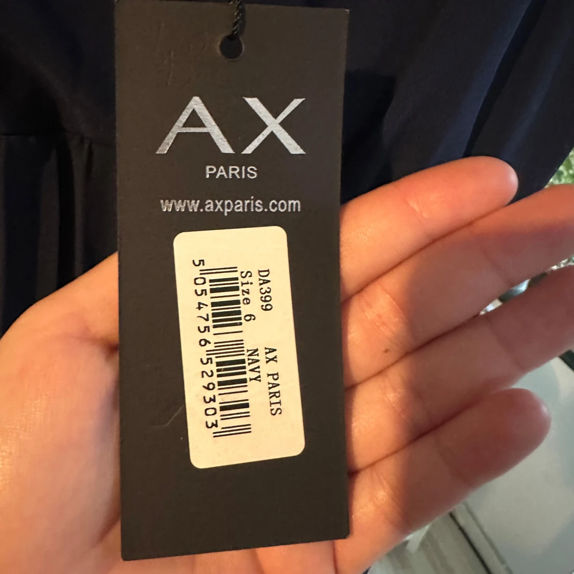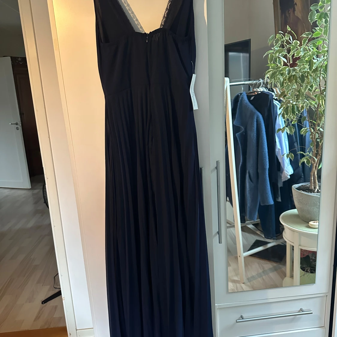 Säljer en elegant mörkblå långklänning från AX Paris i nytt skick. Klänningen har en djup v-ringning och spetsdetaljer vid axelbanden. Perfekt för festliga tillfällen! 💙