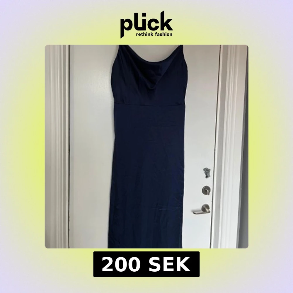 Oanvänd mörkblå lång klänning i siden, som är lite lösare i bysten