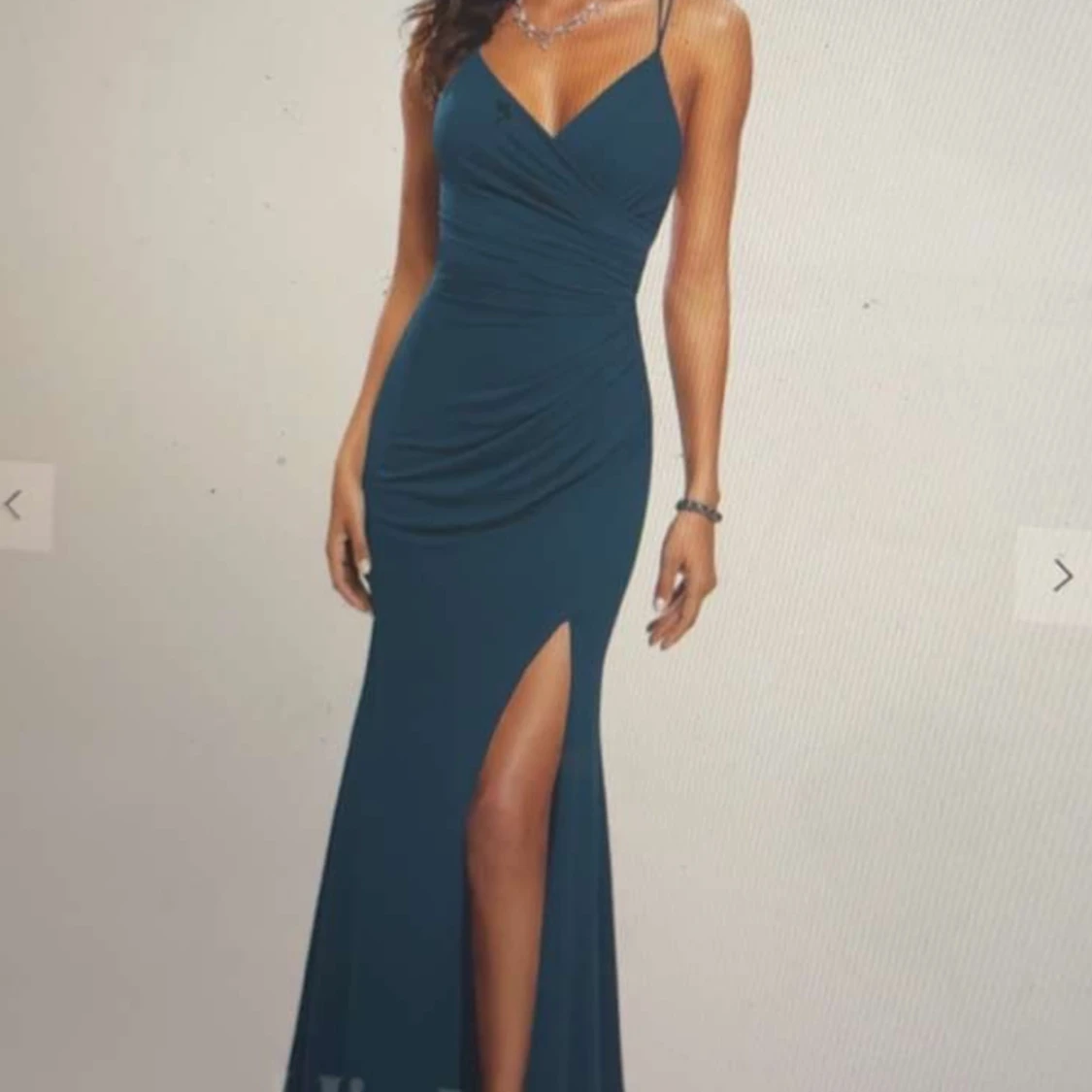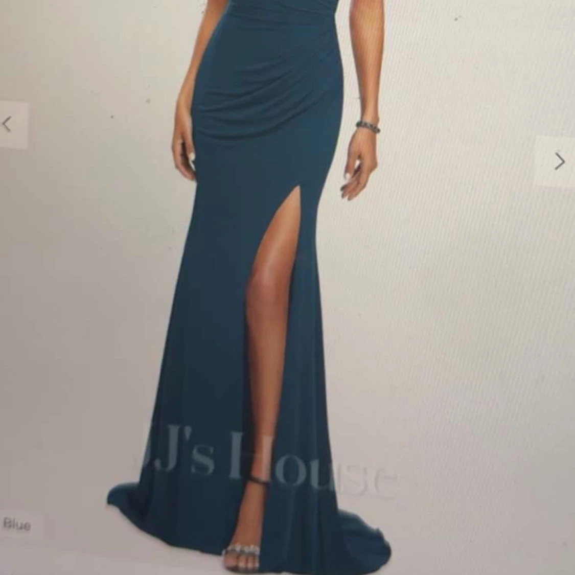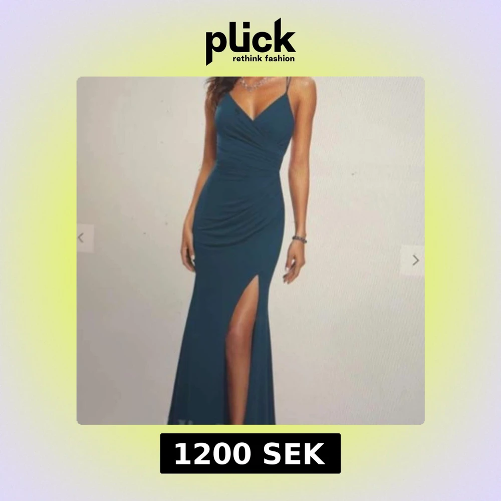 Hej! Säljer min Supersnygga mörkblå balklänning från JJ's House med smala axelband, v-ringning och en hög slits framtill. Klänningen har figurnära passform och draperad detalj över bysten. Perfekt för dig som ska på bal eller fest
