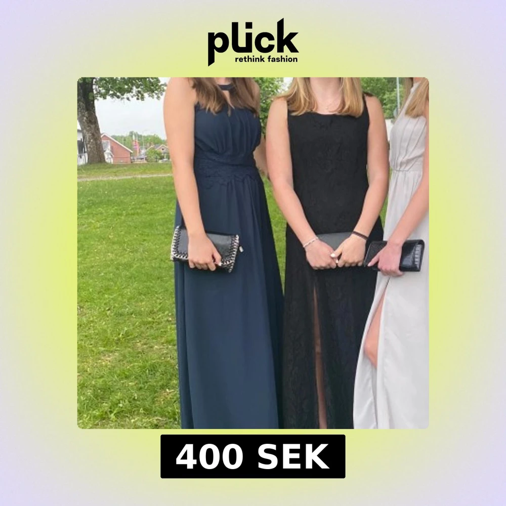 Elegant mörkblå långklänning med spetsdetaljer i midjan. Klänningen har en ärmlös design och en vacker, flytande kjol. Perfekt till bal. Använd en gång